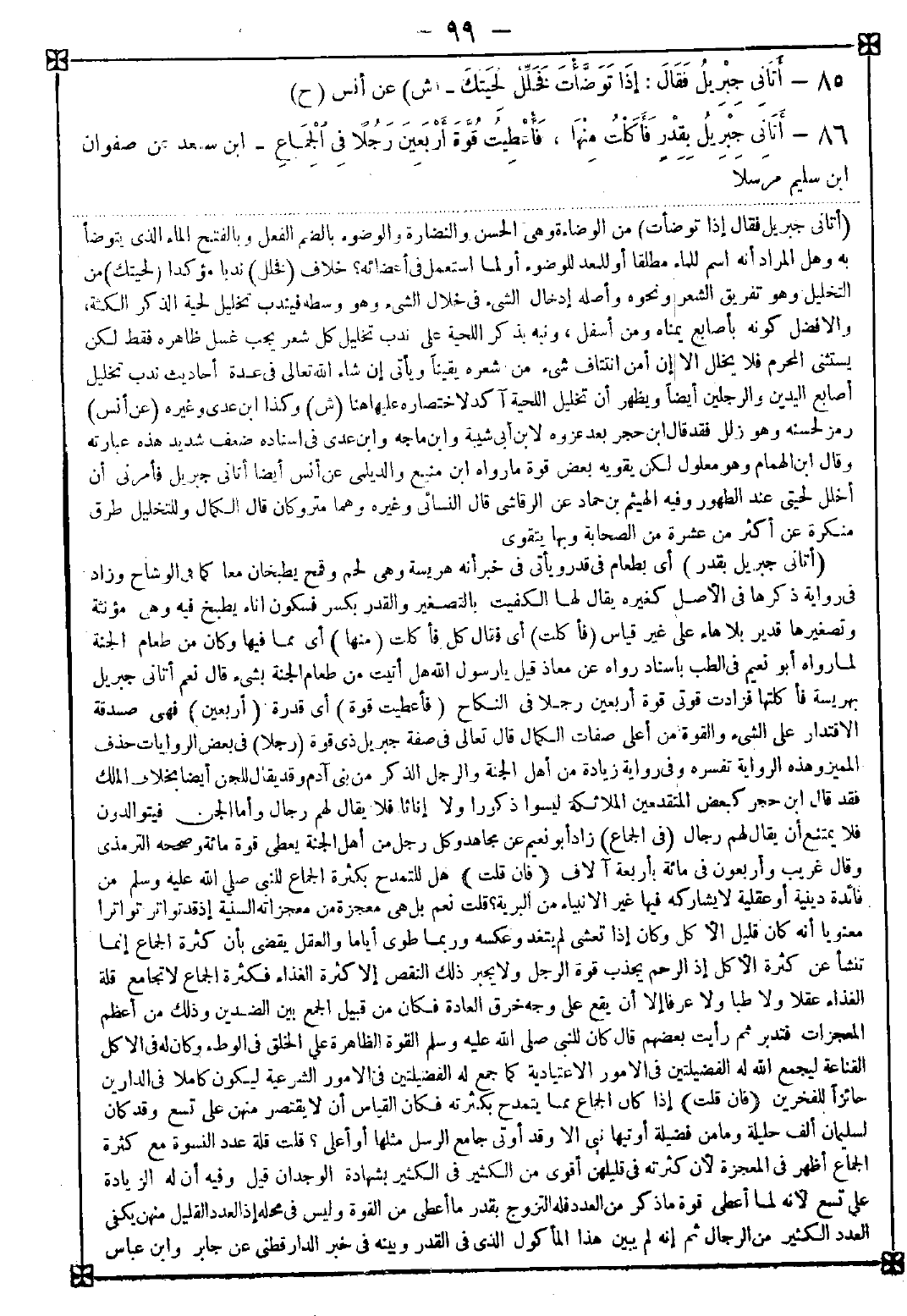 86 - (أتاني جبريل بقدر) أي بطعام في قدر ويأتي في خبر أنه هريسة وهي لحم وقمح يطبخان معا كما في الوشاح وزاد في رواية ذكرها في الأصل كغيره يقال لها الكفيت بالتصغير والقدر بكسر فسكون إناء يطبخ فيه وهي مؤنثة وتصغيرها قدير بلا هاء على غير قياس (فأكلت) أي فقال كل فأكلت (منها) أي مما فيها وكان من طعام الجنة لما رواه أبو نعيم في الطب بإسناد رواه عن معاذ قيل يا رسول الله هل أتيت من طعام الجنة بشيء قال نعم أتاني جبريل بهريسة فأكلتها فزادت قوتي قوة أربعين رجلا في النكاح (فأعطيت قوة) أي قدرة (أربعين) فهي صدقة الاقتدار على الشيء والقوة من أعلى صفات الكمال قال تعالى في صفة جبريل {ذي قوة} . (رجلا) في بعض الروايات حذف المميز وهذه الرواية تفسره وفي رواية زيادة من أهل الجنة والرجل الذكر من بني آدم وقد يقال للجن أيضا بخلاف الملك فقد قال ابن حجر كبعض المتقدمين الملائكة ليسوا ذكورا ولا إناثا فلا يقال لهم رجال وأما الجن فيتوالدون فلا يمتنع أن يقال لهم رجال (في الجماع) زاد أبو نعيم عن مجاهد وكل رجل من أهل الجنة يعطى قوة مئة وصححه الترمذي وقال غريب وأربعون في مئة بأربعة آلاف (فإن قلت) هل للتمدح بكثرة الجماع للنبي صلى الله عليه وسلم من فائدة دينية أو عقلية لا يشاركه فيها غير الأنبياء من البرية؟ قلت: نعم بل هي معجزة من معجزاته السنية إذ قد تواتر تواترا معنويا أنه كان قليل الأكل إذ الرحم يجذب قوة الرجل ولا يجبر ذلك النقص إلا كثرة الغذاء فكثرة الجماع لا تجامع قلة الغذاء عقلا ولا طبا ولا عرفا إلا أن يقع على وجه خرق العادة فكان من قبيل الجمع بين الضدين وذلك من أعظم المعجزات فتدبر ثم رأيت بعضهم قال كان النبي صلى الله عليه وسلم القوة الظاهرة على الخلق في الوطء وكان له في الأكل القناعة ليجمع الله له الفضلين في الأمور الاعتيادية كما جمع له الفضيلتين في الأمور الشرعية ليكون كاملا في الدارين حائزا للفخرين (فإن قلت) إذا كان الجماع مما يمتدح بكثرته فكان القياس أن لا يقتصر منهن على تسع وقد كان لسليمان ألف حليلة وما من فضيلة أوتيها نبي إلا وقد أوتي جامع الرسل مثلها أو أعلى؟ قلت: قلة عدد النسوة مع كثرة الجماع أظهر في المعجزة لأن كثرته في قليلهن أقوى من الكثير في الكثير بشهادة الوجدان قيل: وفيه أن له الزيادة على تسع لأنه لما أعطي قوة ما ذكر من العدد فله التزوج بقدر ما أعطي من القوة وليس في محله إذ العدد القليل منهن يكفي العدد الكثير من الرجال ثم إنه لم يبين هذا المأكول الذي في القدر وبينه في خبر الدارقطني عن جابر وابن عباس -[100]- مرفوعا: أطعمني جبريل الهريسة أشد بها على ظهري وأتقوى بها على الصلاة انتهى قال الذهبي: وهو واه. وقال بعضهم: ضعيف جدا بل ألف الحافظ ابن ناصر الدين فيه جزءا ذكر فيه أنه موضوع سماه رفع الدسيسة عن أخبار الهريسة <تنبيه> أخذ بعضهم من هذا الحديث أنه يندب للرجل تناول ما يقوي شهوته للوقاع كالأدوية المقوية للمعدة لتعظم شهوتها للطعام وكالأدوية المثيرة للشهوة ورده الغزالي بأن المصطفى إنما فعل ذلك لأنه كان عنده منهن العدد الكثير ويحرم على غيره نكاحهن إن طلقهن فكان طلبه القوة لهذا المعنى لا للتلذذ والتنعم وبأنه لا يشتغل قلبه عن ربه بشيء فلا تقاس الملائكة بالحدادين قال وما مثال من يفعل ما يعظم شهوته إلا كمن بلي بسباع ضارية وبهائم عادية فينام عنه أحيانا فيحتال لإثارتها وتهييجها ثم يشتغل بعلاجها وإصلاحها فإن شهوة الطعام والوقاع على التحقيق آلام يراد التخلص منها والتداوي لدفعها عند كمل المؤمنين وأساطين المتقين ووجوه العارفين