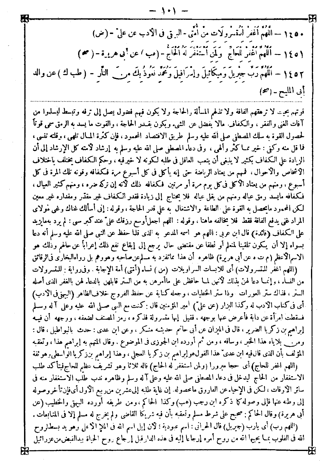 1451 - (اللهم اغفر للحاج) أي حجا مبرورا (ولمن استغفر له الحاج) قاله ثلاثا وهو تشريف عظيم للحاج فيتأكد طلب الاستغفار من الحاج ليدخل في دعاء المصطفى صلى الله عليه وعلى آله وسلم وظاهره ندب طلب الاستغفار منه في سائر الأوقات لكن في الإحياء عن الفاروق ما محصوله: إن غاية طلبه إلى عشرين من ربيع الأول أي فإن تأخر وصوله إلى وطنه عنها فإلى وصوله كما ذكره ابن رجب