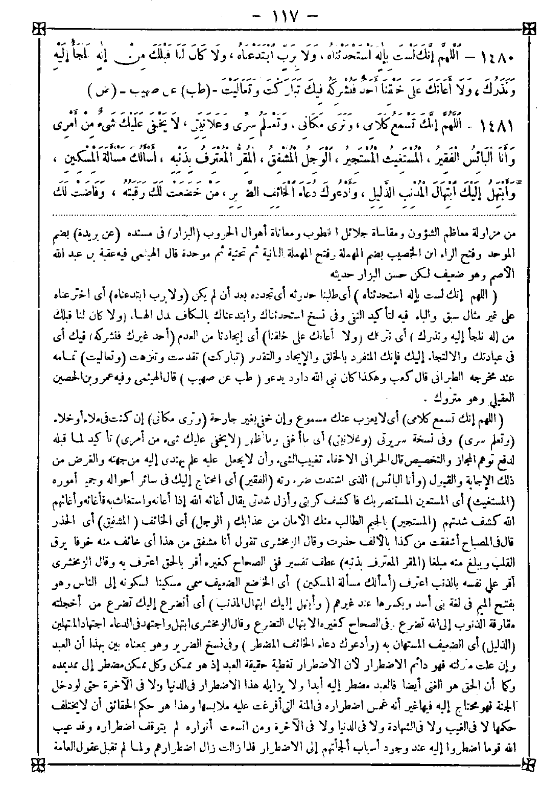 1481 - (اللهم إنك تسمع كلامي) أي لا يعزب عنك مسموع وإن خفي بغير جارحة (وترى مكاني) إن كنت في ملاء أو خلاء (وتعلم سري) وفي نسخة سريرتي (وعلانيتي) أي ما أخفي وما أظهر (لا يخفى عليك شيء من أمري) تأكيد لما قبله لدفع توهم المجاز والتخصيص. قال الحراني: الإخفاء تغييب الشيء وأن لا يجعل عليه علم يهتدي إليه من جهته والغرض من ذلك الإجابة والقبول (وأنا البائس) الذي اشتدت ضرورته (الفقير) أي المحتاج إليك في سائر أحواله وجميع أموره (المستغيث) أي المستعين المستنصر بالله فاكشف كربتي وأزل شدتي يقال أغاثه الله إذا أعانه واستغاث به فأغاثه وأغاثهم الله كشف شدتهم (المستجير) بالجيم الطالب منك الأمان من عذابك (الوجل) أي الخائف (المشفق) أي الحذر قال في المصباح: أشفقت من كذا بالألف حذرت. وقال الزمخشري: تقول أنا مشفق من هذا أي خائف منه خوفا يرق القلب ويبلغ منه مبلغا (المقر المعترف بذنبه) عطف تفسير ففي الصحاح كغيره أقر بالحق اعترف به وقال الزمخشري: أقر على نفسي بالذنب أعترف (أسألك مسألة المسكين) أي الخاضع الضعيف سمي مسكينا لسكونه إلى الناس وهو بفتح الميم في لغة بني أسد وبكسرها عند غيرهم (وأبتهل إليك ابتهال المذنب) أي أتضرع إليك تضرع من أخجلته مقارفة الذنوب إلى الله تضرع. وفي الصحاح كغيره الابتهال التضرع. وقال الزمخشري: ابتهل واجتهد في الدعاء اجتهاد المبتهلين (الذليل) أي الضعيف المستهان به (وأدعوك دعاء الخائف المضطر) وفي نسخ الضرير وهو بمعناه بين بهذا أن العبد وإن علت منزلته فهو دائم الاضطرار لأن الاضطرار تغطية حقيقة العبد إذ هو ممكن وكل ممكن مضطر إلى ممد يمده كما أن الحق هو الغني أيضا فالعبد مضطر إليه أبدا ولا يزايله هذا الاضطرار في الدنيا ولا في الآخرة حتى لو دخل الجنة فهو محتاج إليه فيها غير أنه غمس اضطراره في المنة التي أفرغت عليه ملابسها وهذا هو حكم الحقائق أن لا يختلف حكمها لا في الغيب ولا في الشهادة ولا في الدنيا ولا في الآخرة ومن اتسعت أنواره لم يتوقف اضطراره وقد عيب الله قوما اضطروا إليه عند وجود أسباب ألجأتهم إلى الاضطرار فلما زالت زال اضطرارهم ولما لم تقبل عقول العامة -[118]- إلى ما تعطيه حقيقة وجودهم سلط الله عليهم الأسباب المثيرة للاضطرار ليعرفوا قهر ربوبيته وعظمة إلهيته (من خضعت لك رقبته) أي نكس رأسه رضى بالتذلل إليك وفي الصحاح الخضوع: التطامن والتواضع وقال الزمخشري: خضع لله خضوعا تطامن وقوم خضع ناكسوا الرؤوس ورجل أخضع راضي بالذل (وفاضت) سالت (لك عبرته) بفتح العين أي سال لك من الفرق دموعه وفي الصحاح فاض الماء كثر حتى سال على ضفة الوادي والعبرة بالفتح تحلب الدمع وبالكسر الاعتبار وفي القاموس العبرة بالفتح الدمعة قبل أن تفيض وتردد البكاء في الصدر (وذل لك جسمه) أي انقاد بجميع أركانه الظاهرة والباطنة (ورغم لك أنفه) أي لصق بالتراب وفي الصحاح الرغام بالفتح التراب وأرغم أنفه ألصقه بالتراب. وقال الزمخشري: من المجاز ألصقه بالرغام إذا أذله وأهانه ومنه رغم أنفه وأرغمه الله وفي النهاية أصل رغم أنفه لصق بالتراب ثم استعمل في الذل والعجز عن الانتصاف والانقياد على كره