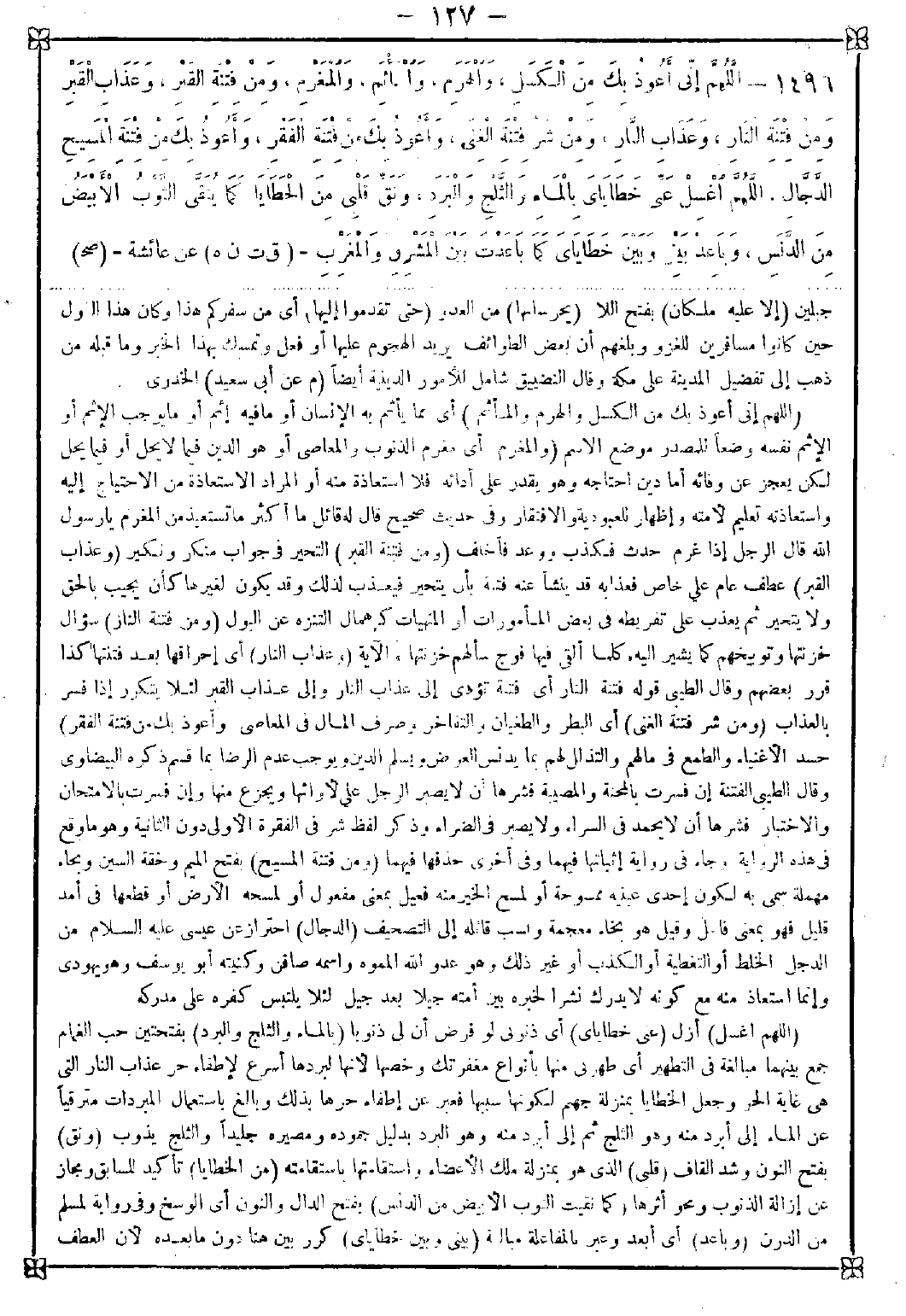 1496 - (اللهم إني أعوذ بك من الكسل والهرم والمأثم) أي ما يأثم به الإنسان أو ما فيه أو ما يوجب الإثم أو الإثم نفسه وضعا للمصدر موضع الاسم (والمغرم) أي مغرم الذنوب والمعاصي أو هو الدين فيما لا يحل أو فيما يحل لكن يعجز عن وفائه أما دين احتاجه وهو يقدر على أدائه فلا استعاذة منه أو المراد الاستعاذة من الاحتياج إليه واستعاذته تعليم لأمته وإظهار للعبودية والافتقار وفي حديث صحيح قال له قائل: ما أكثر ما تستعيذ من المغرم يا رسول الله قال: الرجل إذا غرم حدث فكذب ووعد فأخلف (ومن فتنة القبر) التحير في جواب منكر ونكير (وعذاب القبر) عطف عام على خاص فعذابه قد ينشأ عنه فتنة بأن يتحير فيعذب لذلك وقد يكون لغير ما كان يجيب بالحق ولا يتحير ثم يعذب على تفريطه في بعض المأمورات أو المنهيات كإهمال التنزه عن البول (ومن فتنة النار) سؤال خزنتها وتوبيخهم كما يشير إليه {كلما ألقي فيها فوج سألهم خزنتها} الآية (وعذاب النار) أي إحراقها بعد فتنتها كذا قرر بعضهم وقال الطيبي: قوله فتنة النار أي فتنة تؤدي إلى عذاب النار وإلى عذاب القبر لئلا يتكرر إذا فسر بالعذاب (ومن شر فتنة الغنى) أي البطر والطغيان والتفاخر وصرف المال في المعاصي (وأعوذ بك من فتنة الفقر) حسد الأغنياء والطمع في مالهم والتذلل لهم بما يدنس العرض ويسلم الدين ويوجب عدم الرضا بما قسم ذكره البيضاوي. وقال الطيبي: الفتنة إن فسرت بالمحنة والمصيبة فشرها أن لا يصير الرجل على لأوائها ويجزع منها وإن فسرت بالامتحان والاختبار فشرها أن لا يحمد في السراء ولا يصبر في الضراء وذكر لفظ شر في الفقرة الأولى دون الثانية وهو ما وقع في هذه الرواية وجاء في رواية إثباتها فيهما وفي أخرى حذفها فيهما (ومن فتنة المسيح) بفتح الميم وخفة السين وبحاء مهملة سمي به لكون إحدى عينيه ممسوحة أو لمسح الخير منه فعيل بمعنى مفعول أو لمسحه الأرض أو قطعها في أمد قليل فهو بمعنى فاعل وقيل هو بخاء معجمة ونسب قائله إلى التصحيف (الدجال) احتراز عن عيسى عليه السلام من الدجل الخلط أو التغطية أو الكذب أو غير ذلك وهو عدو الله المموه واسمه صافن وكنيته أبو يوسف وهو يهودي وإنما استعاذ منه مع كونه لا يدرك نشرا لخبره بين أمته جيلا بعد جيل لئلا يلتبس كفره على مدركه