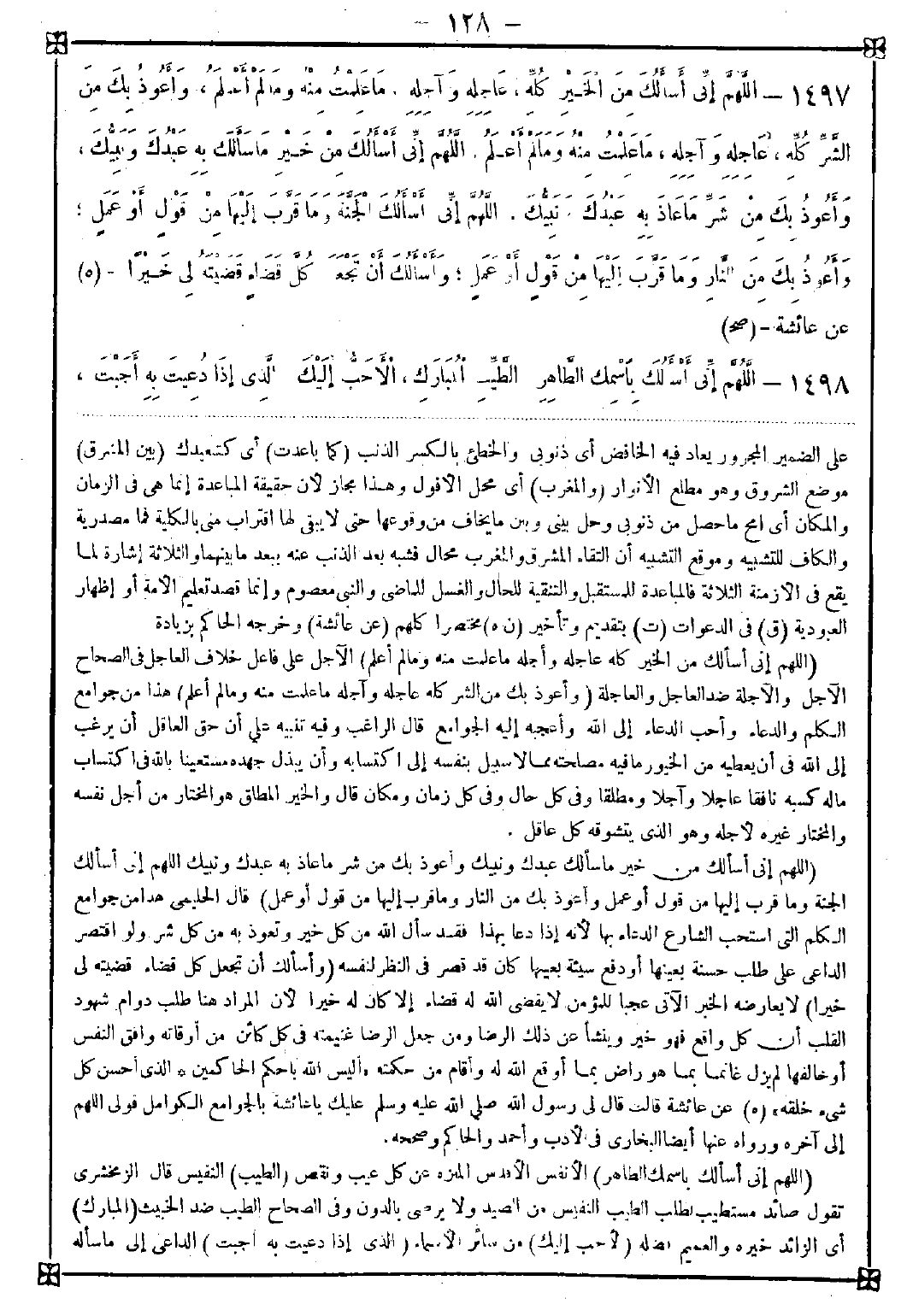 1497 - (اللهم إني أسألك من الخير كله عاجله وأجله ما علمت منه وما لم أعلم) الآجل على فاعل خلاف العاجل في الصحاح الآجل والآجلة ضد العاجل والعاجلة (وأعوذ بك من الشر كله عاجله وآجله ما علمت منه وما لم أعلم) هذا من جوامع الكلم والدعاء وأحب الدعاء إلى الله وأعجبه إليه الجوامع. قال الراغب: وفيه تنبيه على أن حق العاقل أن يرغب إلى الله أن يعطيه من الخيور ما فيه مصلحته مما لا سبيل بنفسه إلى اكتسابه وأن يبذل جهده مستعينا بالله في اكتساب ماله كسبه نافقا عاجلا وآجلا ومطلقا وفي كل حال وفي كل زمان ومكان قال: والخير المطلق هو المختار من أجل نفسه والمختار غيره لأجله وهو الذي يتشوفه كل عاقل
