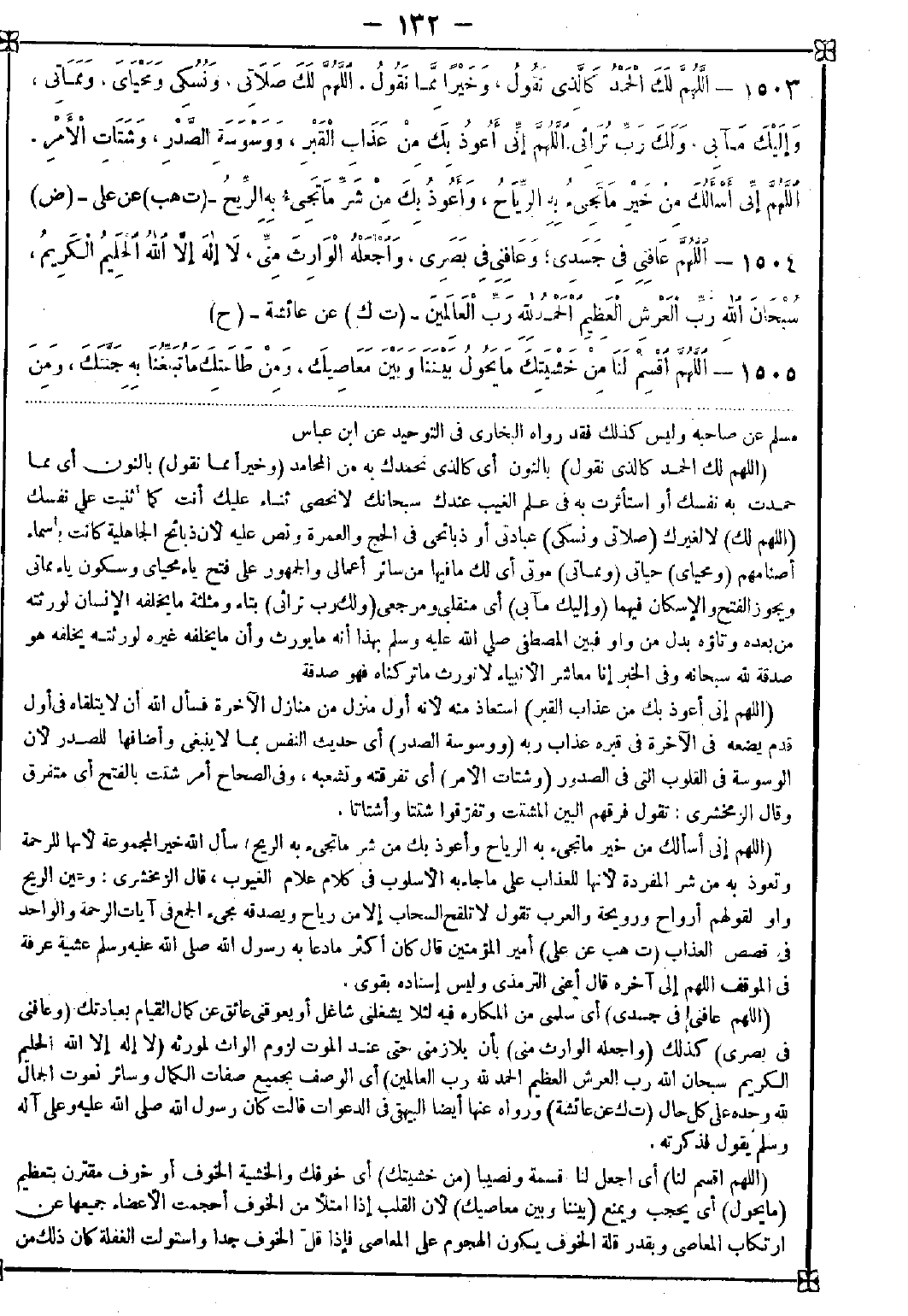 1505 - (اللهم اقسم لنا) أي اجعل لنا قسمة ونصيبا (من خشيتك) أي خوفك والخشية الخوف أو خوف مقترن بتعظيم (ما يحول) أي يحجب ويمنع (بيننا وبين معاصيك) لأن القلب إذا امتلأ من الخوف أحجمت الأعضاء جميعها عن ارتكاب المعاصي وبقدر قلة الخوف يكون الهجوم على المعاصي فإذا قل الخوف جدا واستولت الغفلة كان ذلك من -[133]- علامة الشقاء ومن ثم قالوا المعاصي بريد الكفر كما أن القبلة بريد الجماع والغناء بريد الزنا والنظر بريد العشق والمرض بريد الموت وللمعاصي من الآثار القبيحة المذمومة المضرة بالعقل والبدن والدنيا والآخرة ما لا يحصيه إلا الله (ومن طاعتك ما تبلغنا به جنتك) أي مع شمولنا برحمتك وليست الطاعة وحدها مبلغة بدليل خبر: لن يدخل أحدكم الجنة بعمله قالوا: ولا أنت يا رسول الله؟ قال: ولا أنا إلا أن يتغمدني الله برحمته (ومن اليقين) أي وارزقنا من اليقين بك وبأنه لا راد لقضائك وقدرك (ما يهون) أي يسهل (علينا مصائب الدنيا) بأن نعلم أن ما قدرته لا يخلو عن حكمة ومصلحة واستجلاب مثوبة وأنك لا تفعل بالعبد شيئا إلا وفيه صلاحه (ومتعنا بأسماعنا وأبصارنا وقوتنا ما أحييتنا واجعله الوارث منا) قال القاضي: الضمير في اجعل للمصدر اجعل الجعل والوارث هو المفعول الأول ومنا في محل المفعول الثاني بمعنى اجعل الوارث من نسلنا لا كلالة خارجة عنا أو الضمير للتمتع ومعناه اجعل تمتعنا بها باقيا عنا موروثا لمن بعدنا أو محفوظا لنا ليوم الحاجة وهو المفعول الأول والوارث مفعول ثان ومنا صلة أو الضمير لما سبق من الأسماع والأبصار والقوة وإفراده وتذكيره وتأنيثه بتأويل المذكور ومعنى وراثتها لزومها له عند موته لزوم الوارث له (واجعل ثأرنا على من ظلمنا) أي مقصورا عليه ولا تجعلنا ممن تعدى في طلب ثأره فأخذ به غير الجاني كما في الجاهلية أو اجعل إدراك ثأرنا على من ظلمنا فندرك به ثأرنا (وانصرنا على من عادانا) أي ظفرنا عليه وانتقم منه (ولا تجعل مصيبتنا في دينينا) أي لا تصيبنا بما ينقص ديننا من أكل حرام واعتقاد سوء وفترة في عبادة (ولا تجعل الدنيا أكبر همنا) فإن ذلك سبب للهلاك وفي إفهامه أن قليل الهم بما لا بد منه من أمر المعاش مرخص فيه بل مستحب (ولا مبلغ علمنا) بحيث تكون جميع معلوماتنا الطرق المحصلة للدنيا والعلوم الجالية لها بل ارزقنا علم طريق الآخرة (ولا تسلط علينا من لا يرحمنا) أي لا تجعلنا مغلوبين للظلمة والكفرة أو لا تجعل الظالمين علينا حاكمين أو من لا يرحمنا من ملائكة العذاب في القبر والنار وغيرهما ذكره كله القاضي. قال الطيبي: فإن قلت بين لي تأليف هذا النظم وأي وجه من الوجوه المذكورة أولى قلت أن تجعل الضمير للتمتع والمعنى اجعل ثأرنا مقصورا على من ظلمنا ولا تجعلنا ممن تعدى في طلب ثأره وتحمل من لا يرحمنا علي ملائكة العذاب في القبر وفي النار لئلا يلزم التكرار فتقول إنما خص البصر والسمع بالتمتع من الحواس لأن الدلائل الموصلة إلى معرفته تعالى وتوحيده إنما تحصل من طريقهما لأن البراهين إنما تكون مأخوذة من الآيات المنزلة وذلك بطريق السمع أو من الآيات المقصوصة في الآفاق والأنفس وذلك بطريق البصر فسأل التمتع بهما حذرا من الانخراط في سلك الذين ختم الله على قلوبهم وعلى سمعهم وعلى أبصارهم غشاوة ولما حصلت المعرفة ترتب عليها العبادة فسأل القوة ليتمكن بها من عبادة ربه ثم إنه أراد أن لا ينقطع هذا الفيض الإلهي عنه لكونه رحمة العالمين فسأل بقاء ذلك ليستن بسنته بعده فقال: واجعل ذلك التمتع وارثا باقيا منا