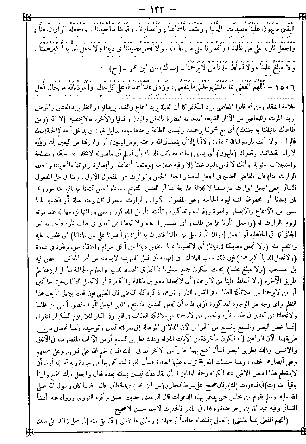 1506 - (اللهم انفعني بما علمتني) بالعمل بمقتضاه خالصا لوجهك (وعلمني ما ينفعني) لأرتقي منه إلى عمل زائد على ذلك -[134]- (وزدني علما) مضافا إلى ما علمتنيه وهذه إشارة إلى طلب المزيد في السير والسلوك إلى أن يوصله إلى مخدع الوصال وبه ظهر أن العلم وسيلة للعمل وهما متلازمان ومن ثم قالوا: ما أمر الله رسوله بطلب الزيادة في شيء إلا في العلم (الحمد لله على كل حال) من أحوال السراء والضراء وكم يترتب على الضراء من عواقب حميدة ومواهب كريمة يستحق الحمد عليها {وعسى أن تكرهوا شيئا وهو خير لكم} قال في الحكم: من ظن انفكاك لطفه عن قدره فذاك لقصور نظره. وقال الغزالي: لا شدة إلا وفي جنبها نعم لله فليلزم الحمد والشكر على تلك النعم المقترنة بها قال عمر رضي الله تعالى عنه: ما ابتليت ببلية إلا كان لله علي فيها أربع نعم إذ لم تكن في ديني وإذ لم أحرم الرضا وإذ لم تكن أعظم وإذ رجوت الثواب عليها. وقال إمام الحرمين: شدائد الدنيا مما يلزم العبد الشكر عليها لأنها نعم بالحقيقة بدليل أنها تعرض العبد لمنافع عظيمة ومثوبات جزيلة وأغراض كريمة تتلاشى في جنبها شدائد (وأعوذ بالله من حال أهل النار) في النار وغيرها. قال الطيبي: وما أحسن موقع الحمد في هذا المقام ومعنى المزيد فيه {ولئن شكرتم لأزيدنكم} وموقع الاستعاذة من الحال المضاف إلى النار تلميحا إلى القطيعة والبعد وهذا الدعاء من جوامع الكلم التي لا مطمح وراءها