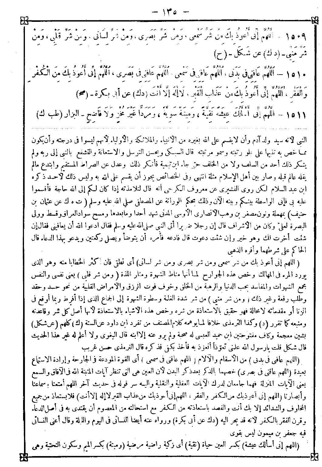 1510 - (اللهم عافني في بدني) من الأسقام والآلام (اللهم عافني في سمعي) أي القوة المودعة في الجارحة وإرادة الاستماع بعيدة (اللهم عافني في بصري) خصهما بالذكر بعد ذكر البدن لأن العين هي التي تنظر آيات الله المثبتة في الآفاق والسمع يعني الآيات المنزلة فهما جامعان لدرك الآيات العقلية والنقلية وإليه سر قوله في حديث آخر اللهم أمتعنا بأسماعنا وأبصارنا (اللهم إني أعوذ بك من الكفر والفقر اللهم إني أعوذ بك من عذاب القبر لا إله إلا أنت) فلا يستعاذ من جميع المخاوف والشدائد إلا بك أنت والقصد باستعاذته من الكفر مع استحالته من المعصوم أن يقتدي به في أصل الدعاء وقرن الفقر بالكفر لأنه قد يجر إليه
