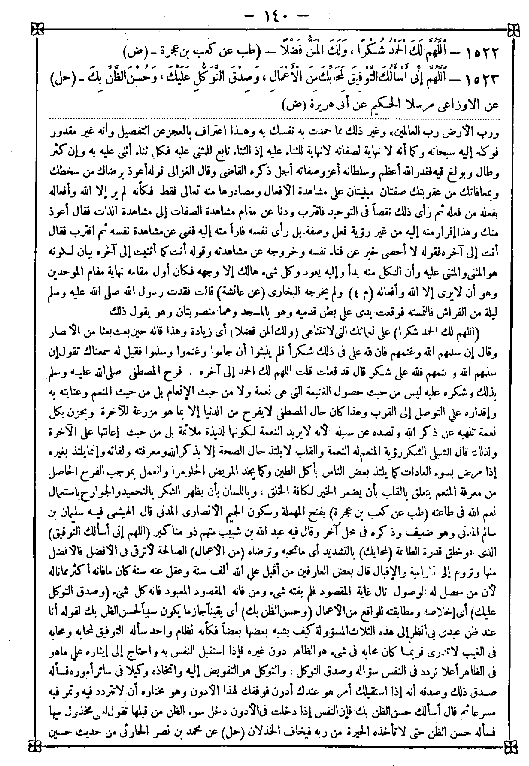 1522 - (اللهم لك الحمد شكرا) على نعمائك التي لا تتناهى (ولك المن فضلا) أي زيادة وهذا قاله حين بعث بعثا من الأنصار وقال إن سلمهم الله وغنمهم فإن لله علي في ذلك شكرا فلم يلبثوا أن جاؤوا وغنموا وسلموا فقيل له سمعناك تقول إن سلمهم الله وغنمهم فلله علي شكر قال قد فعلت قلت اللهم لك الحمد إلى آخره. فرح المصطفى صلى الله عليه وسلم بذلك وشكره عليه ليس من حيث حصول الغنيمة التي هي نعمة ولا من حيث الإنعام بل من حيث المنعم وعنايته به وإقداره على التوصل إلى القرب وهذا كان حال المصطفى لا يفرح من الدنيا إلا بما هو مزرعة للآخرة ويحزن بكل نعمة تلهيه عن ذكر الله وتصده عن سبيله لأنه لا يريد النعمة لكونها لذيذة ملائمة بل من حيث إعانتها على الآخرة ولذلك قال الشبلي: الشكر رؤية المنعم له النعمة والقلب لا يلتذ حال الصحة إلا بذكر الله ومعرفته ولقائه وإنما يلتذ بغيره إذا مرض بسوء العادات كما يلتذ بعض الناس بأكل الطين وكما يجد المريض الحلو مرا والعمل بموجب الفرح الحاصل من معرفة المنعم يتعلق بالقلب بأن يضمر الخير لكافة الخلق وباللسان بأن يظهر الشكر بالتحميد والجوارح باستعمال نعم الله في طاعته