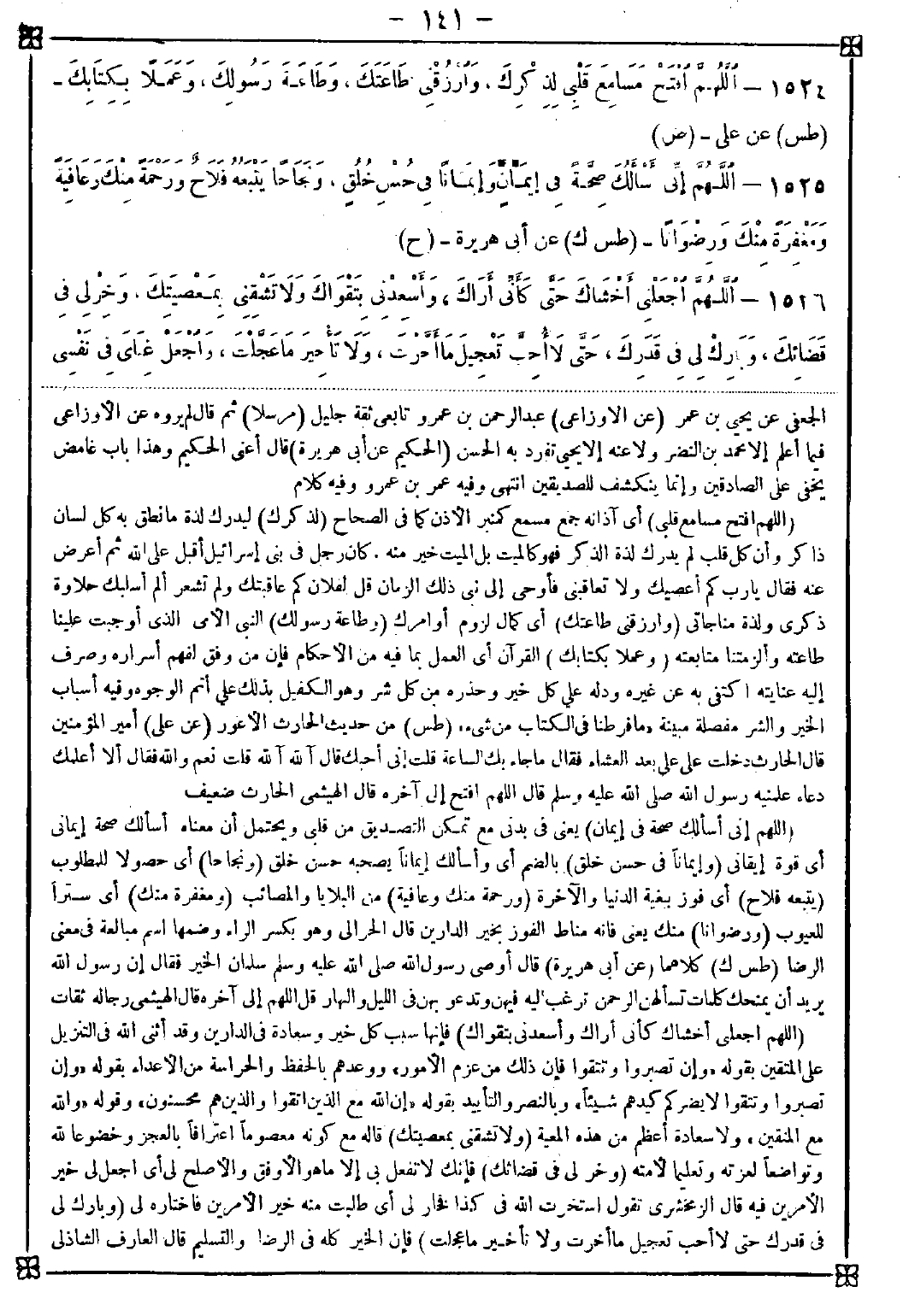 1524 - (اللهم افتح مسامع قلبي) أي آذانه جمع مسمع كمنبر الأذن كما في الصحاح (لذكرك) ليدرك لذة ما نطق به كل لسان ذاكر وأن كل قلب لم يدرك لذة الذكر فهو كالميت بل الميت خير منه. كان رجل في بني إسرائيل أقبل على الله ثم أعرض عنه فقال يا رب كم أعصيك ولا تعاقبني فأوحى إلى نبي ذلك الزمان قل لفلان كم عاقبتك ولم تشعر ألم أسلبك حلاوة ذكري ولذة مناجاتي (وارزقني طاعتك) أي كمال لزوم أوامرك (وطاعة رسولك) النبي الأمي الذي أوجبت علينا طاعته وألزمتنا متابعته (وعملا بكتابك) القرآن أي العمل بما فيه من الأحكام فإن من وفق لفهم أسراره وصرف إليه عنايته اكتفى به عن غيره ودله على كل خير وحذره من كل شر وهو الكفيل بذلك على أتم الوجوه وفيه أسباب الخير والشر مفصلة مبينة {ما فرطنا في الكتاب من شيء}