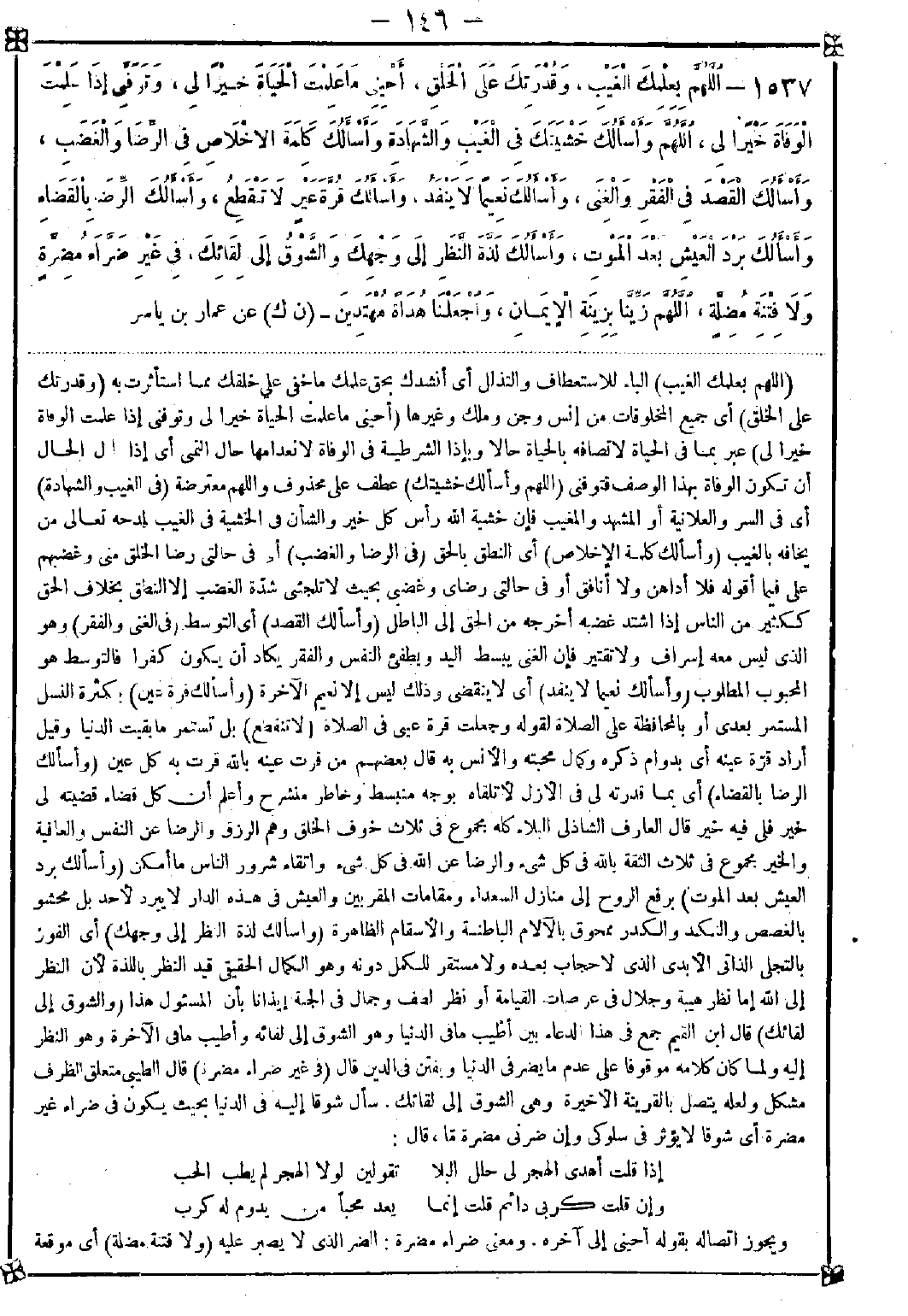 -[146]- 1537 - (اللهم بعلمك الغيب) الباء للاستعطاف والتذلل أي أنشدك بحق علمك ما خفي على خلقك مما استأثرت به (وقدرتك على الخلق) أي جميع المخلوقات من إنس وجن وملك وغيرها (أحيني ما علمت الحياة خيرا لي وتوفني إذا علمت الوفاة خيرا لي) عبر بما في الحياة لاتصافه بالحياة حالا وبإذا الشرطية في الوفاة لانعدامها حال التمني أي إذا آل الحال أن تكون الوفاة بهذا الوصف فتوفني (اللهم وأسألك خشيتك) عطف على محذوف واللهم معترضة (في الغيب والشهادة) أي في السر والعلانية أو المشهد والمغيب فإن خشية الله رأس كل خير والشأن في الخشية في الغيب لمدحه تعالى من يخافه بالغيب (وأسألك كلمة الإخلاص) أي النطق بالحق (في الرضا والغضب) أي في حالتي رضا الخلق مني وغضبهم علي فيما أقوله فلا أداهن ولا أنافق أو في حالتي رضاي وغضبي بحيث لا تلجئني شدة الغضب إلا النطق بخلاف الحق ككثير من الناس إذا اشتد غضبه أخرجه من الحق إلى الباطل (وأسألك القصد) أي التوسط (في الغنى والفقر) وهو الذي ليس معه إسراف ولا تقصير فإن الغنى يبسط اليد ويطفىء النفس والفقر يكاد أن يكون كفرا فالتوسط هو المحبوب المطلوب (وأسألك نعيما لا ينفد) أي لا ينقضي وذلك ليس إلا نعيم الآخرة (وأسألك قرة عين) بكثرة النسل المستمر بعدي أو بالمحافظة على الصلاة لقوله وجعلت قرة عيني في الصلاة (لا تنقطع) بل تستمر ما بقيت الدنيا وقيل أراد قرة عينه أي بدوام ذكره وكمال محبته والأنس به. قال بعضهم: من قرت عينه بالله قرت به كل عين (وأسألك الرضا بالقضاء) أي بما قدرته لي في الأزل لأتلقاه بوجه منبسط وخاطر منشرح وأعلم أن كل قضاء قضيته خير فلي فيه خير. قال العارف الشاذلي: البلاء كله مجموع في ثلاث خوف الخلق وهم الرزق والرضا عن النفس والعافية والخير مجموع في ثلاث الثقة بالله في كل شيء والرضا عن الله في كل شيء واتقاء شرور الناس ما أمكن (وأسألك برد العيش بعد الموت) برفع الروح إلى منازل السعداء ومقامات المقربين والعيش في هذه الدار لا يبرد لأحد بل محشو بالغصص والنكد والكدر ممحوق بالآلام الباطنة والأسقام الظاهرة (وأسألك لذة النظر إلى وجهك) أي الفوز بالتجلي الذاتي الأبدي الذي لا حجاب بعده ولا مستقر للكمل دونه وهو الكمال الحقيقي قيد النظر باللذة لأن النظر إلى الله إما نظر هيبة وجلال في عرصات القيامة أو نظر لطف وجمال في الجنة إيذانا بأن المسؤول هذا (والشوق إلى لقائك) قال ابن القيم: جمع في هذا الدعاء بين أطيب ما في الدنيا وهو الشوق إلى لقائه وأطيب ما في الآخرة وهو النظر إليه ولما كان كلامه موقوفا على عدم ما يضر في الدنيا ويفتن في الدين قال (في غير ضراء مضرة) قال الطيبي: متعلق الظرف مشكل ولعله يتصل بالقرينة الأخيرة وهي الشوق إلى لقائك. سأل شوقا إليه في الدنيا بحيث يكون في ضراء غير مضرة أي شوقا لا يؤثر في سلوكي وإن ضرني مضرة ما قال: