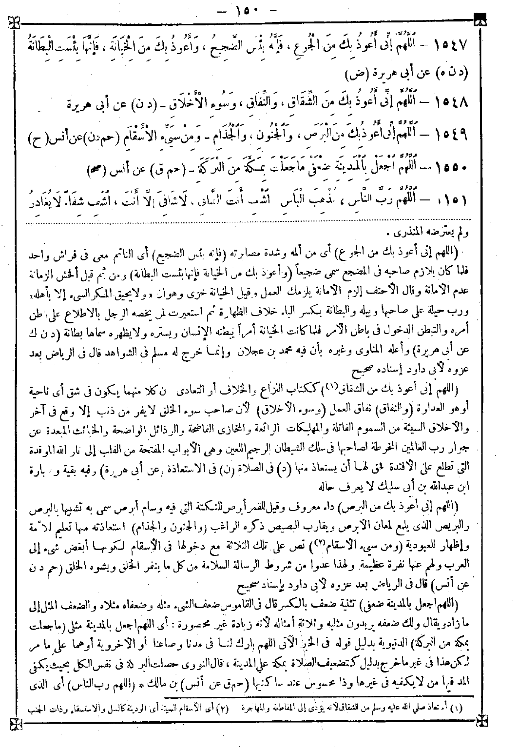 1549 - (اللهم إني أعوذ بك من البرص) داء معروف وقيل للقمر أبرص للنكتة التي فيه وسام أبرص سمي به تشبيها بالبرص والبريص الذي يلمع لمعان الأبرص ويقارب البصيص ذكره الراغب (والجنون والجذام) استعاذته منها تعليم للأمة وإظهار للعبودية (ومن سيء الأسقام (1)) نص على تلك الثلاثة مع دخولها في الأسقام لكونها أبغض شيء إلى العرب ولهم عنها نفرة عظيمة ولهذا عدوا من شروط الرسالة السلامة من كل ما ينفر الخلق ويشوه الخلق