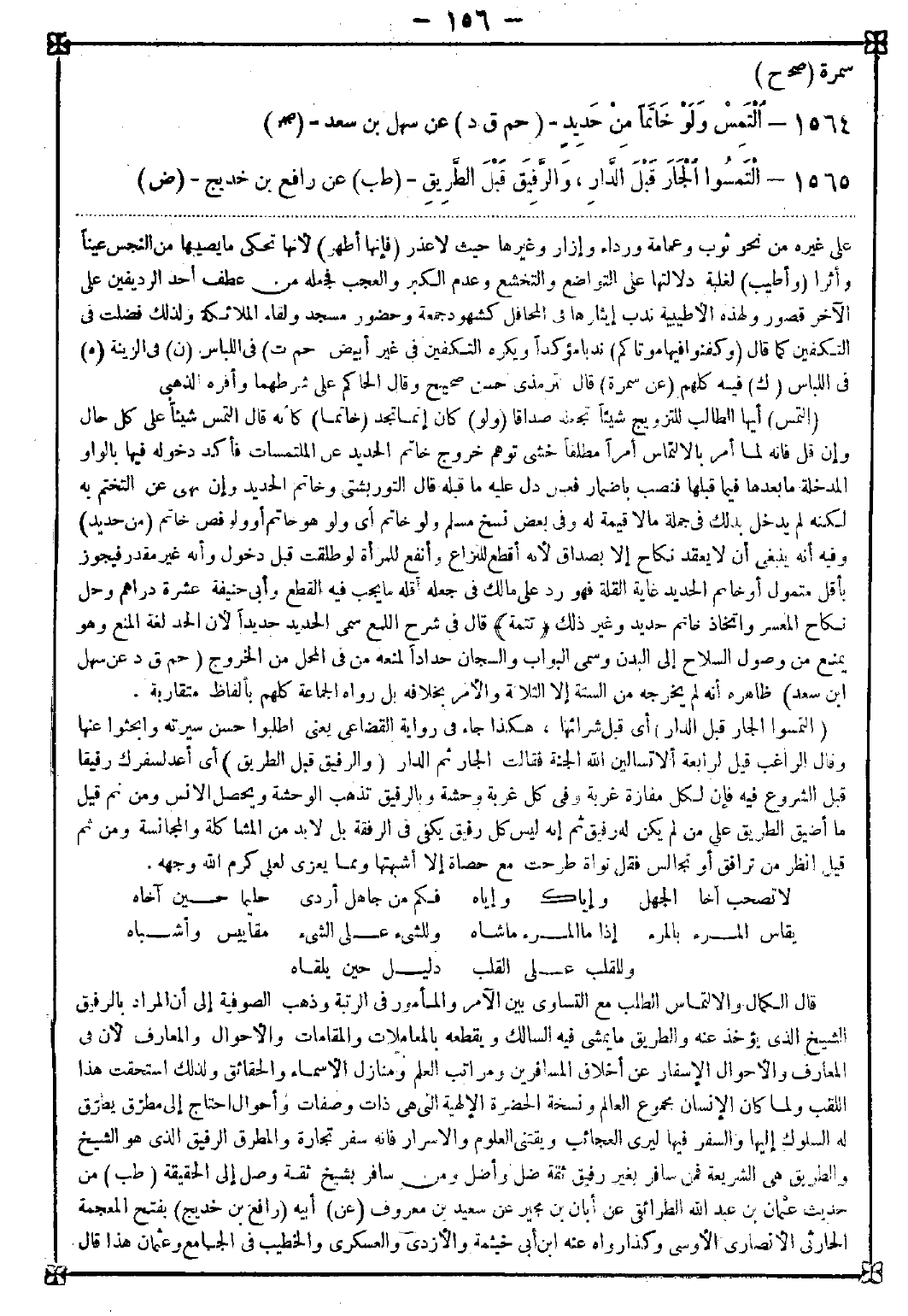 1565 - (التمسوا الجار قبل الدار) أي قبل شرائها هكذا جاء في رواية القضاعي يعني اطلبوا حسن سيرته وابحثوا عنها. وقال الراغب: قيل لرابعة ألا تسألين الله الجنة فقالت: الجار ثم الدار (والرفيق قبل الطريق) أي أعد لسفرك رفيقا قبل الشروع فيه فإن لكل مفازة غربة وفي كل غربة وحشة وبالرفيق تذهب الوحشة ويحصل الأنس ومن ثم قيل ما أضيق الطريق على من لم يكن له رفيق ثم إنه ليس كل رفيق يكفي في الرفقة بل لابد من المشاكلة والمجانسة ومن ثم قيل انظر من ترافق أو تجالس فقل نواة طرحت مع حصاة إلا أشبهتها ومما يعزى لعلي كرم الله وجهه: