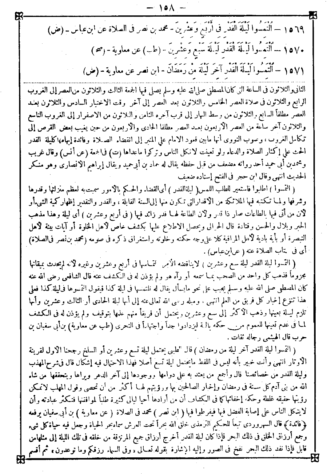 1570 - (التمسوا ليلة القدر ليلة سبع وعشرين) لا يناقضه الأمر بالتماسها في أربع وعشرين وغيره لأنه لم يحدث بميقاتها مجزوما فذهب كل واحد من الصحب بما سمعه أو رآه هو ولم يؤذن له في الكشف عنه قال الشافعي رضي الله عنه كان المصطفى صلى الله عليه وسلم يجيب على نحو ما يسأل يقال له نلتمسها في ليلة كذا فيقول التمسوها في ليلة كذا فعلى هذا تنوع إخبار كل فريق من العلم انتهى وميله رضي الله تعالى عنه إلى أنها ليلة الحادي أو الثالث وعشرين وأنها تلزم ليلة بعينها وذهب الأكثر إلى سبع وعشرين ويحتمل أن فريقا منهم علمها بتوقيف ولم يؤذن له بالكشف لما في عدم تعينها للعموم من حكمة بالغة ليزدادوا جدا واجتهادا في التحري