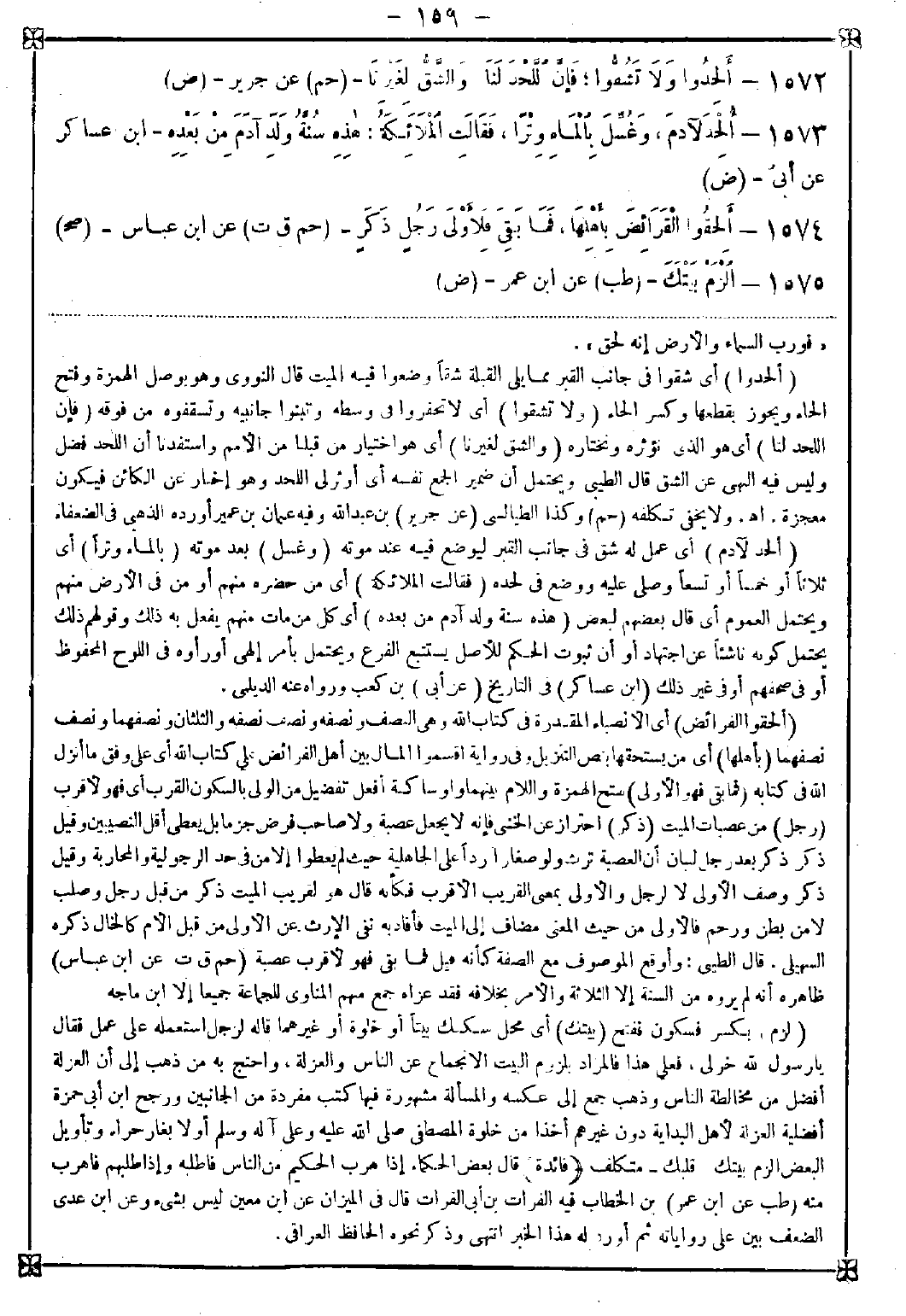 1574 - (الحقوا الفرائض) أي الأنصباء المقدرة في كتاب الله وهي النصف ونصفه ونصف نصفه والثلثان ونصفهما ونصف نصفهما (بأهلها) أي من يستحقها بنص التنزيل في رواية اقسموا المال بين أهل الفرائض على كتاب الله على وفق ما أنزل الله في كتابه (فما بقي فهو الأولى) بفتح الهمزة واللام بينهما واو ساكنة أفعل تفضيل من الولي بالسكون القرب بأي فهو الأقرب (رجل) من عصبات الميت (ذكر) احتراز عن الخنثى فإنه لا يجعل عصبة ولا صاحب فرض جزما بل يعطى أقل النصيبين وقيل ذكر ذكر بعد رجل لسان أن العصبة ترث ولو صغارا ردا على الجاهلية حيث لم يعطوا إلا من في حد الرجولية والمحاربة وقيل ذكر وصف الأولى لا لرجل والأولى بمعنى القريب الأقرب فكأنه قال هو لقريب الميت ذكر من قبل رجل وصلب لا من بطن ورحم فالأولى من حيث المعنى مضاف إلى الميت فأفاد به نفي الإرث عن الأولى من قبل الأم كالخال ذكره السهيلي. قال الطيبي: وأوقع الموصوف مع الصفة كأنه قيل فما بقي فهو لأقرب عصبة