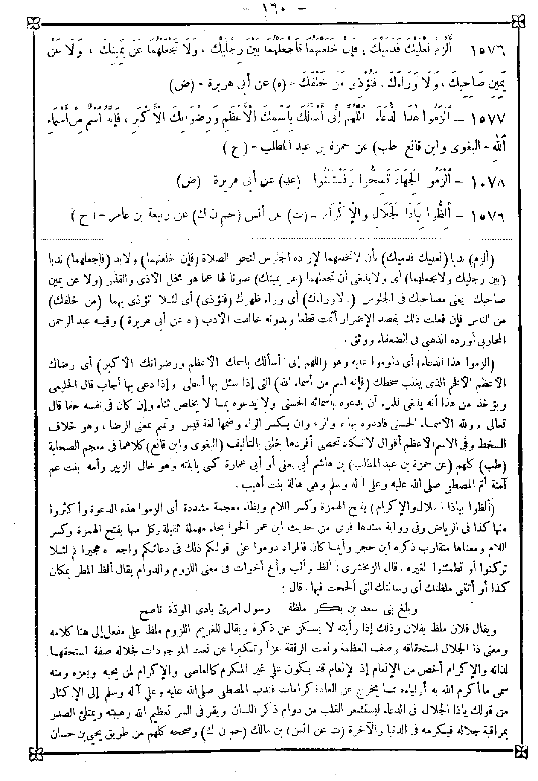 1579 - (ألظوا بياذا الجلال والإكرام) بفتح الهمزة وكسر اللام وبظاء معجمة مشددة أي الزموا هذه الدعوة وأكثروا منها كذا في الرياض وفي رواية سندها قوي من حديث ابن عمر ألحوا بحاء مهملة ثقيلة وكل منها بفتح الهمزة وكسر اللام ومعناها متقارب ذكره ابن حجر وأيما كان فالمراد دوموا على قولكم ذلك في دعائكم واجعلوه هجيراكم لئلا تركنوا أو تطمئنوا لغيره قال الزمخشري: ألظ وألب وألج أخوات في معنى اللزوم والدوام ويقال ألظ المطر بمكان كذا أو أتتني ملظتك أي رسالتك التي ألححت فيها قال: