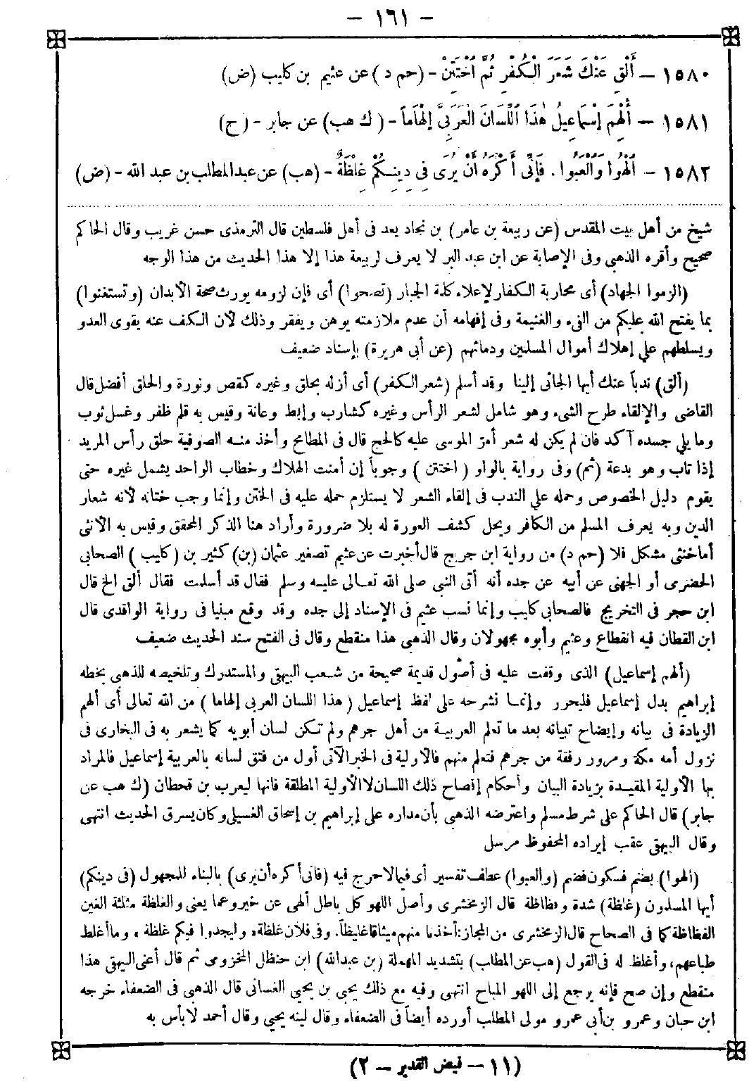 1581 - (ألهم إسماعيل) الذي وقفت عليه في أصول قديمة صحيحة من شعب البيهقي والمستدرك وتلخيصه للذهبي بخطه إبراهيم بدل إسماعيل فليحرر وإنما نشرحه على لفظ إسماعيل (هذا اللسان العربي إلهاما) من الله تعالى أي ألهم الزيادة في بيانه وإيضاح تبيانه بعد ما تعلم العربية من أهل جرهم ولم تكن لسان أبويه كما يشعر به في البخاري في نزول أمه مكة ومرور رفقة من جرهم فتعلم منهم فالأولية في الخبر الآتي أول من فتق لسانه بالعربية إسماعيل فالمراد بها الأولية المقيدة بزيادة البيان وأحكام إفصاح ذلك اللسان لا الأولية المطلقة فإنها ليعرب بن قحطان