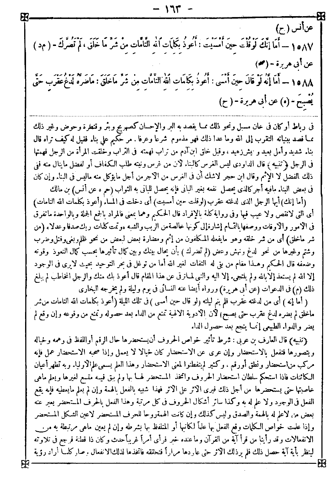 1587 - (أما إنك) أيها الرجل كالذي لدغته عقرب (لو قلت حين أمسيت) أي دخلت في المساء (أعوذ بكلمات الله التامات) أي التي لا نقص ولا عيب فيها وفي رواية كلمة بالإفراد قال الحكيم وهما بمعنى فالمراد بالجمع الجملة وبالواحدة ما تفرق في الأمور والأوقات ووصفها بالتمام إشارة إلى كونها خالصة من الريب والشبه {وتمت كلمات ربك صدقا وعدلا} (من شر ما خلق) أي من شر خلقه وهو ما يفعله المكلفون من إثم ومضارة بعض لبعض من نحو ظلم وبغي وقتل وضرب وشتم وغيرها من نحو لدغ ونهش وعض (لم تضرك) بأن يحال بينك وبين كمال تأثيرها بحسب كمال التعوذ وقوته وضعفه قال الحكيم: وهذا مقام من يقي له التفات لغير الله أما من توغل في بحر التوحيد بحيث لا يرى في الوجود إلا الله لم يستعذ إلا بالله ولم يلتجىء إلا إليه والنبي لما ترقى عن هذا المقام قال أعوذ بك منك والرجل المخاطب لم يبلغ ذلك