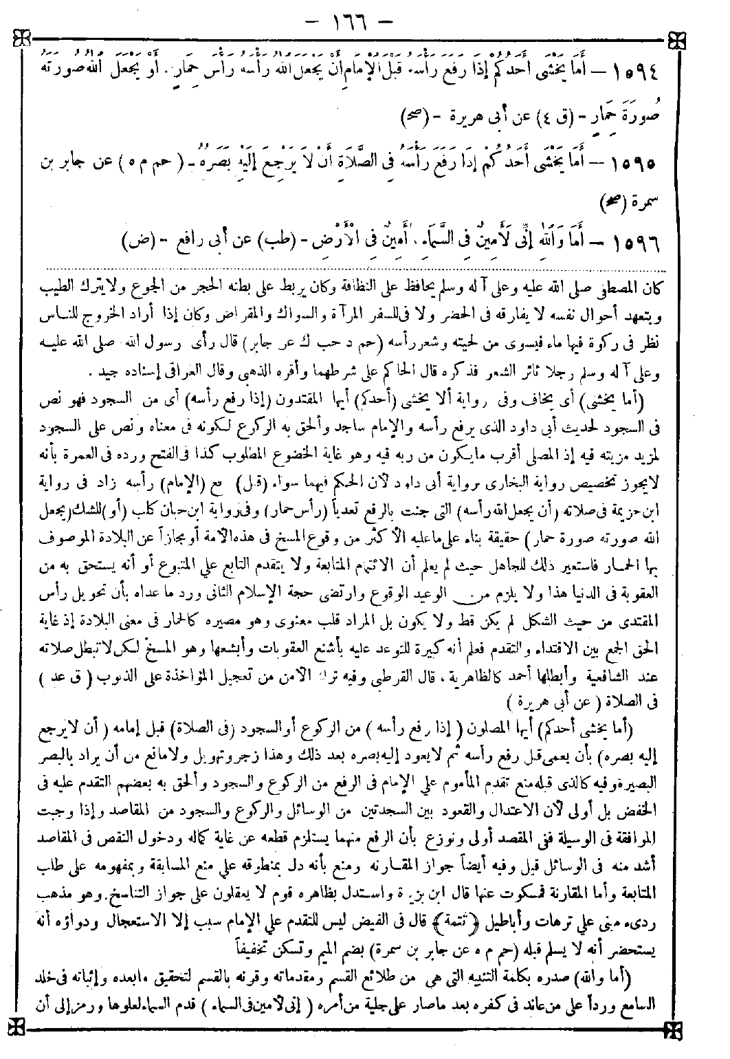 1595 - (أما يخشى أحدكم) أيها المصلون (إذا رفع رأسه) من الركوع أو السجود (في الصلاة) قبل إمامه (أن لا يرجع إليه بصره) بأن يعمى قبل رفع رأسه ثم لا يعود إليه بصره بعد ذلك وهذا زجر وتهويل ولا مانع من أن يراد بالبصر البصيرة وفيه كالذي قبله منع تقدم المأموم على الإمام في الرفع من الركوع والسجود وألحق به بعضهم التقدم عليه في الخفض بل أولى لأن الاعتدال والقعود بين السجدتين من الوسائل والركوع والسجود من المقاصد وإذا وجبت الموافقة في الوسيلة ففي المقصد أولى ونوزع بأن الرفع منهما يستلزم قطعه عن غاية كماله ودخول النقص في المقاصد أشد منه في الوسائل قيل وفيه أيضا جواز المقارنة ومنع بأنه دل بمنطوقه على منع المسابقة وبمفهومه على طلب المتابعة وأما المقارنة فمسكوت عنها قال ابن بزيرة واستدل بظاهره قوم لا يعقلون على جواز التناسخ وهو مذهب رديء مبني على ترهات وأباطيل. (تتمة) قال في الفيض: ليس للتقدم على الإمام سبب إلا الاستعجال ودواؤه أنه يستحضر أنه لا يسلم قبله