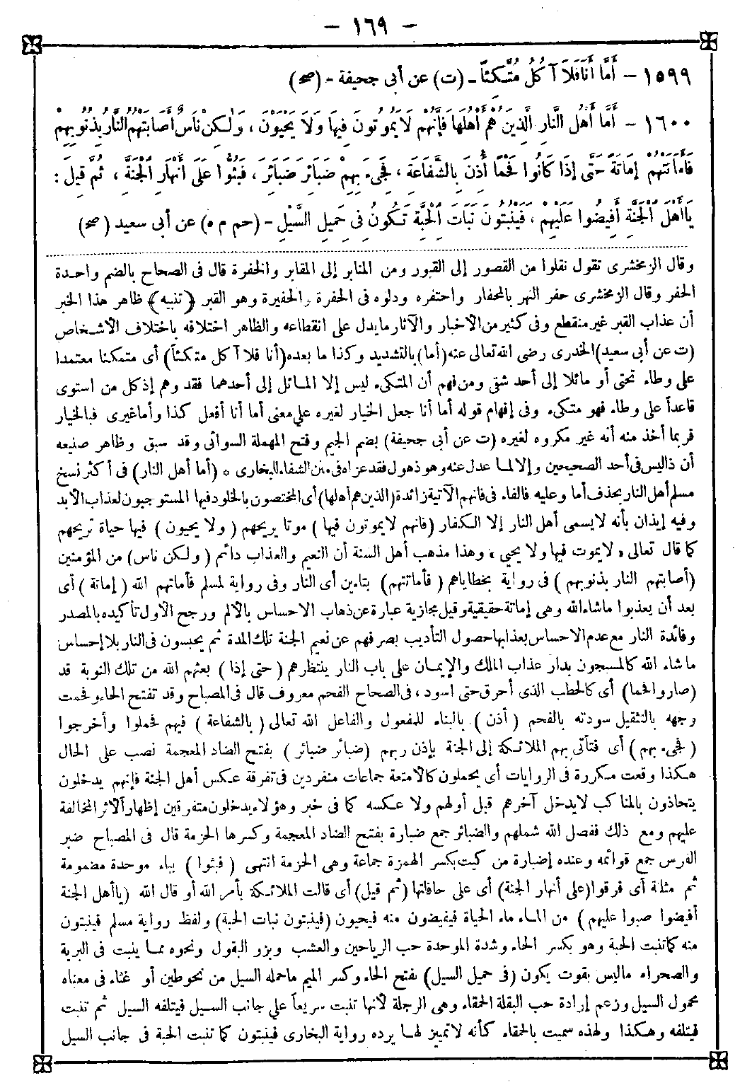 1600 - (أما أهل النار) في أكثر نسخ مسلم أهل النار بحذف أما وعليه فالفاء في فإنهم الآتية زائدة (الذين هم أهلها) أي المختصون بالخلود فيها المستوجبون لعذاب الأبد وفيه إيذان بأنه لا يسمى أهل النار إلا الكفار (فإنهم لا يموتون فيها) موتا يريحهم (ولا يحيون) فيها حياة تريحهم كما قال تعالى {لا يموت فيها ولا يحيى} وهذا مذهب أهل السنة أن النعيم والعذاب دائم (ولكن ناس) من المؤمنين (أصابتهم النار بذنوبهم) في رواية بخطاياهم (فأماتتهم) بتاءين أي النار وفي رواية لمسلم فأماتهم الله (إمانة) أي بعد أن يعذبوا ما شاء الله وهي إماتة حقيقية وقيل مجازية عبارة عن ذهاب الإحساس بالألم ورجح الأول تأكيده بالمصدر وفائدة النار مع عدم الإحساس بعذابها حصول التأديب بصرفهم عن نعيم الجنة تلك المدة ثم يحبسون في النار بلا إحساس ما شاء الله كالمسبحون بدار عذاب الملك والإيمان على باب النار ينتظرهم (حتى إذا) بعثهم الله من تلك النوبة قد (صاروا فحما) أي كالحطب الذي أحرق حتى اسود في الصحاح الفحم معروف قال في المصباح: وقد تفتح الحاء وفحمت وجهه بالتثقيل سودته بالفحم (أذن) بالبناء للمفعول والفاعل الله تعالى (بالشفاعة) فيهم فحملوا وأخرجوا (فجيء بهم) أي فتأتي بهم الملائكة إلى الجنة بإذن ربهم (ضبائر ضبائر) بفتح الضاد المعجمة نصب على الحال هكذا وقعت مكررة في الروايات أي يحملون كالأمتعة جماعات منفردين في تفرقة عكس أهل الجنة فإنهم يدخلون يتحاذون بالمناكب لا يدخل آخرهم قبل أولهم ولا عكسه كما في خبر. وهؤلاء يدخلون متفرقين إظهارا لأثر المخالفة عليهم ومع ذلك ففصل الله شملهم والضبائر جمع ضبارة بفتح الضاد المعجمة وكسرها الحزمة. قال في المصباح: ضبر الفرس جمع قوائمه وعنده إضبارة من كيت بكسر الهمزة جماعة وهي الحزمة انتهى (فبثوا) بباء موحدة مضمومة ثم مثلثة أي فرقوا (على أنهار الجنة) أي على حافاتها (ثم قيل) أي قالت الملائكة بأمر الله أو قال الله (يا أهل الجنة أفيضوا) صبوا (عليهم) من الماء ماء الحياة فيفيضون منه فيحيون (فينبتون نبات الحبة) ولفظ رواية مسلم فينبتون منه كما تنبت الحبة وهو بكسر الحاء وشدة الموحدة حب الرياحين والعشب وبزر البقول ونحوه مما ينبت في البرية والصحراء ما ليس بقوت يكون (في حميل السيل) بفتح الحاء وكسر الميم ما حمله السيل من نحو طين أو غثاء في معناه محمول السيل وزعم إرادة حب البقلة الحمقاء وهي الرجلة لأنها تنبت سريعا على جانب السيل فيتلفه السيل ثم تنبت فيتلفه وهكذا ولهذه سميت بالحمقاء كأنه لا تمييز لها يرده رواية البخاري فينبتون كما تنبت الحبة في جانب السيل -[170]- ألم تر أنها تخرج صفراء ملتوية وبقلة الحمقاء ليست صفراء وإنما كانت صفراء لأنها أحسن ألوان الرياحين ولهذا تسر الناظرين وسيد رياحين الجنة الحناء وهو أصفر والمراد التشبيه في سرعة النبات وطراوته وحسن لونه وضعف النبات فهو كناية عن سرعة نباتهم وحسن ألوانهم وضعف حالهم ثم يشتد قواهم بعد ويصيرون إلى منازلهم شبه سرعة عود إنباتهم بسرعة نباتها وفي خبر يكتب على جباههم هؤلاء عتقاء الرحمن قيل وماء الحياة معنوي ولا مانع من كونه حسيا وفيه رد على المرجئة حيث أفاد دخول طائفة من الأمة النار وعلى المعتزلة لدلالته على عدم تخليد العاصي فيها