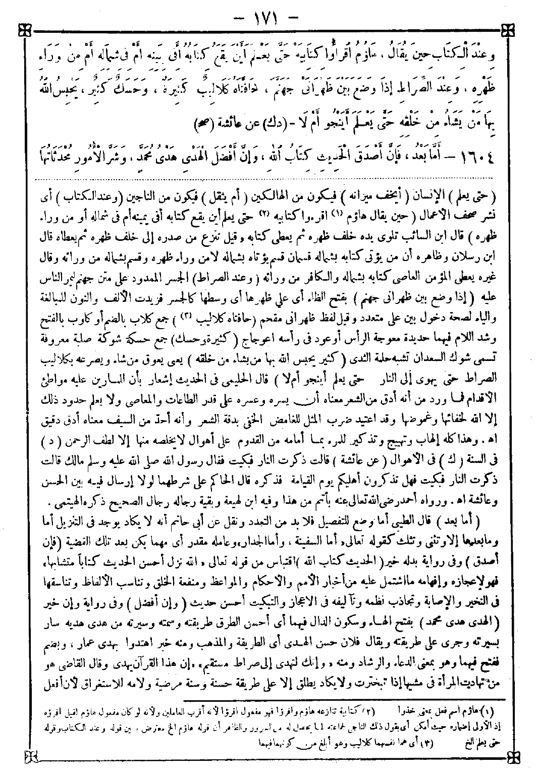 1604 - (أما بعد) قال الطيبي: أما وضع للتفصيل فلا بد من التعدد ونقل عن أبي حاتم أنه لا يكاد يوجد في التنزيل أما وما بعدها إلا وتثنى وتثلث كقوله تعالى {أما السفينة وأما الجدار} وعامله مقدر أي مهما يكن بعد تلك القضية (فإن أصدق) وفي رواية بدله خير (الحديث كتاب الله) اقتباس من قوله تعالى {الله نزل أحسن الحديث كتابا متشابها} فهو لإعجازه وإفهامه ما اشتمل عليه من أخبار الأمم والأحكام والمواعظ ومنفعة الخلق وتناسب الألفاظ وتناسقها في التخير والإصابة وتجاذب نظمه وتآليفه في الإعجاز والتبكيت أحسن حديث (وإن أفضل) وفي رواية وإن خير (الهدي هدي محمد) بفتح الهاء وسكون الدال فيهما أي أحسن الطرق طريقته وسمته وسيرته من هدى هديه سار بسيرته وجرى على طريقته ويقال فلان حسن الهدي أي الطريقة والمذهب ومنه خبر " اهتدوا بهدي عمار " وبضم ففتح فيهما وهو بمعنى الدعاء والرشاد ومنه {وإنك لتهدي إلى صراط مستقيم} إن هذا القرآن يهدي. وقال القاضي: هو من تهادت المرأة في مشيها إذا تبخترت ولا يكاد يطلق إلا على طريقة حسنة وسنة مرضية ولامه للاستغراق لأن أفعل -[172]- التفضيل لا يضاف إلا إلى متعدد وهو داخل فيه ولأنه لو لم يكن للاستغراق لم يفد المعنى المقصود وهو تفضيل دينه وسنته على جميع السنن والأديان (وشر الأمور محدثاتها) جمع محدثة بالفتح وهي كما سبق ما لم يعرف من كتاب ولا سنة ولا إجماع. قال القاضي: روي شر الأمور بالنصب عطف على اسم إن وهو الأشهر وبالرفع عطف على محل إن مع اسمه (وكل بدعة ضلالة) أي وكل فعلة أحدثت على خلاف الشرع ضلالة لأن الحق فيما جاء به الشارع فما لا يرجع إليه يكون ضلالة إذ ليس بعد الحق إلا الضلال (وكل ضلالة في النار) فكل بدعة فيها وقد سبق ذا موضحا بما منه أن المراد بالمحدث الذي هو بدعة وضلالة ما لا أصل له في الشرع والحامل عليه مجرد شهوة أو إرادة بخلاف محدث له أصل فيه إما بحمل النظير على نظيره أو لغير ذلك وقوله وكل إلى آخره عام مخصوص (أتتكم الساعة بغتة) بنصبه على المفعولية وجوز رفعه. قال في الكشاف: الساعة القيامة سميت به لأنها تقوم في آخر ساعة من ساعات الدنيا أو لأنها تقع بغتة وبديهة كما تقول في ساعة لمن تستعجله وجرت علما لها كالنجم للثريا والكوكب للزهرة (بعثت أنا والساعة هكذا) وقرن بين إصبعيه السبابة والوسطى. قال القاضي: يحتمل أنه تمثيل لمقارنتها وأنه ليس إصبع أخرى كما لا شيء بينه وبين الساعة ويحتمل أنه تقريب لما بينهما في المدة وأن التفاوت بينهما كنسبة التفاوت بين الأصبعين تقريبا لا تحديدا (صبحتكم الساعة ومستكم) أي توقعوا قيامها فكأنكم بها وقد فجأتكم على بغتة صباحا أو مساء فبادروا إلى التوبة لتسقط عنكم المعاصي وازهدوا في الدنيا ليخف حسابكم وتذكروا الآخرة وأهوالها وما هو إلا من نفس إلى نفس فتصيرون إليها {إنما توعدون لآت وما أنتم بمعجزين} (أنا أولى بكل مؤمن من نفسه) أي أحق. كان إذا احتاج لنحو طعام وجب على صاحبه بذله له {النبي أولى بالمؤمنين من أنفسهم} (من ترك مالا فلأهله) الذين يرثونه (ومن ترك دينا) عليه لم يوفه في حياته (أو ضياعا) بفتح الضاد أي عيالا وأطفالا (فإلي وعلي) أي فأمر كفاية عياله إلي وعلي قضاء دينه فهو لف ونشر غير مرتب (وأنا ولي المؤمنين) جميعا كان المصطفى صلى الله عليه وسلم لا يصلي على مدين مات ولم يخلف وفاء زجرا للناس عن الاستدانة وإهمال الوفاء فلما فتح الله تعالى على المسلمين قال: من ترك دينا فعلي وفاؤه أي قضاؤه وهل كان يقضيه تكرما أو وجوبا؟ وجهان الأصح الثاني ثم قيل إن ذا من خصائصه وقيل بل يقضى في كل زمن من المال وفيه أنه يسن أن يقال في الخطب أما بعد