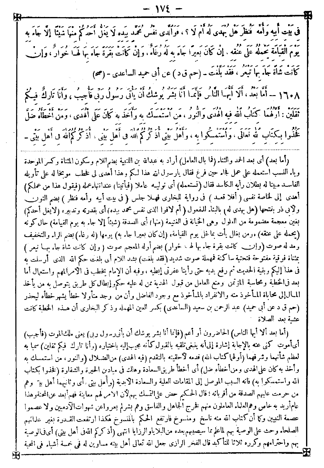 -[174]- 1607 - (أما بعد) أي بعد الحمد والثناء (فما بال العامل) أراد به عبد الله بن اللتيبة بضم اللام وسكون المثناة وكسر الموحدة وياء النسب استعمله على عمل فجاء حين فرغ فقال: يا رسول الله هذا لكم وهذا أهدي لي فخطب موبخا له على تأويله الفاسد مبينا له بطلان رأيه الكاسد فقال (نستعمله) أي نوليه عاملا (فيأتينا) عند انتهاء عمله (فيقول هذا من عملكم) أهدي إلي لخاصة نفسي (أفلا قعد) في رواية للبخاري فهلا جلس (في بيت أبيه وأمه فنظر) بضم النون ولأبي ذر بفتحها (هل يهدى له) بالبناء للمفعول (أم لا فوا الذي نفس محمد بيده) أي بقدرته وتدبيره (لا يغل أحدكم) بغين معجمة مضمومة من الغلول وهي الخيانة في الغنيمة (منها) أي الصدقة (شيئا إلا جاء به يوم القيامة) حال كونه (يحمله على عنقه) {ومن يغلل يأت بما غل يوم القيامة} (إن كان بعيرا جاء به) يومها (له رغاء) بضم الراء والتخفيف ومد له صوت (وإن كانت بقرة جاء بها لها خوار) بضم أوله المعجم صوت (وإن كانت شاة جاء بها تيعر) بمثناة فوقية مفتوحة فتحتية ساكنة فمهملة صوت شديد (فقد بلغت) بشد اللام أي بلغت حكم الله الذي أرسلت به في هذا إليكم وبقية الحديث ثم رفع يديه حتى رأينا عفرتي إبطيه وفيه أن الإمام يخطب في الأمر المهم واستعمال أما بعد في الخطبة ومحاسبة المؤتمن ومنع العامل من قبول الهدية ممن له عليه حكم وإبطال كل طريق يتوصل به من يأخذ المال إلى محاباة المأخوذ منه والانفراد بالمأخوذ مع وجود الفاضل وأن من وجد متأولا خطأ يشهر خطأه ليحذر