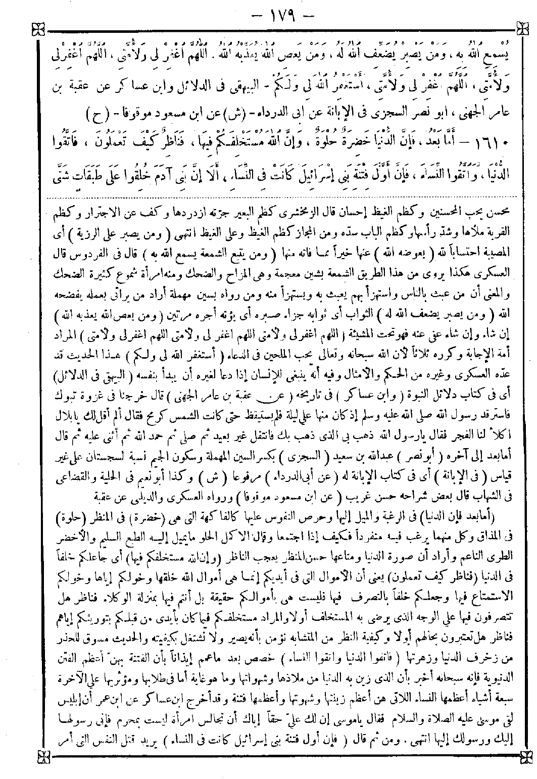 1610 - (أما بعد فإن الدنيا) في الرغبة والميل إليها وحرص النفوس عليها كالفاكهة التي هي (خضرة) في المنظر (حلوة) في المذاق وكل منهما يرغب فيه منفردا فكيف إذا اجتمعا وقال الأكمل الحلو ما يميل إليه الطبع السليم والأخضر الطري الناعم وأراد أن صورة الدنيا ومتاعها حسن المنظر يعجب الناظر (وإن الله مستخلفكم فيها) أي جاعلكم خلفا في الدنيا (فناظر كيف تعملون) يعني أن الأموال التي في أيديكم إنما هي أموال الله خلقها وخولكم إياها وخولكم الاستمتاع فيها وجعلكم خلفا بالتصرف فيها فليست هي بأموالكم حقيقة بل أنتم فيها بمنزلة الوكلاء فناظر هل تتصرفون فيها على الوجه الذي يرضى به المستخلف أو لا والمراد مستخلفكم فيما كان بأيدي من قبلكم بتوريثكم إياهم فناظر هل تعتبرون بحالهم أو لا وكيفية النظر من المتشابه نؤمن بأنه يصير ولا تشتغل بكيفيته والحديث مسوق للحذر من زخرف الدنيا وزهرتها (فاتفوا الدنيا واتقوا النساء) خصص بعد ما عمم إيذانا بأن الفتنة بهن أعظم الفتن الدنيوية فإنه سبحانه أخبر بأن الذي زين به الدنيا من ملاذها وشهواتها وما هو غاية أما في طلابها ومؤثريها على الآخرة سبعة أشياء أعظمها النساء اللاتي هن أعظم زينتها وشهوتها وأعظمها فتنة وقد أخرج ابن عساكر عن ابن عمر أن إبليس لقي موسى عليه الصلاة والسلام فقال يا موسى إن لك علي حقا إياك أن تجالس أمرأة ليست بمحرم فإني رسولها إليك ورسولك إليها انتهى. ومن ثم قال (فإن أول فتنة بني إسرائيل كانت في النساء) يريد قتل النفس التي أمر -[180]- بنو إسرائيل فيها بذبح البقرة واسم المقتول عاميل قتله ابن أخيه أو عمه ليتزوج ابنته أو زوجته. وقال في المطامح: يحتمل كونه أشار إلى قصة هاروت وماروت لأنهما فتنا بسبب امرأة من بني إسرائيل ويحتمل أنه أشار إلى قضية بلعام بن باعوراء لأنه إنما هلك بمطاوعة زوجته وبسببهن هلك كثير من العلماء (ألا إن بني آدم خلقوا على طبقات شتى) أي متفرقة قال في الصحاح: أمر شتت بالفتح أي متفرق وشتته فرقه وقوم شتى وأشتاتا أي متفرقون وقال الزمخشري: تقول تفرقوا شتى وأشتاتا (منهم من يولد ويحيا مؤمنا ويموت مؤمنا) وهذا الفريق هم سعداء الدنيا والآخرة (ومنهم من يولد كافرا ويحيا كافرا ويموت كافرا) وهذا القسم هم أهل الشقاوة (ومنهم من يولد مؤمنا ويحيا مؤمنا ويموت كافرا) أي يسبق عليه الكتاب فيختم له بالكفر (ومنهم من يولد كافرا ويحيا كافرا ويموت مؤمنا) أي يختم له بالإيمان فيصير من أهل السعادة