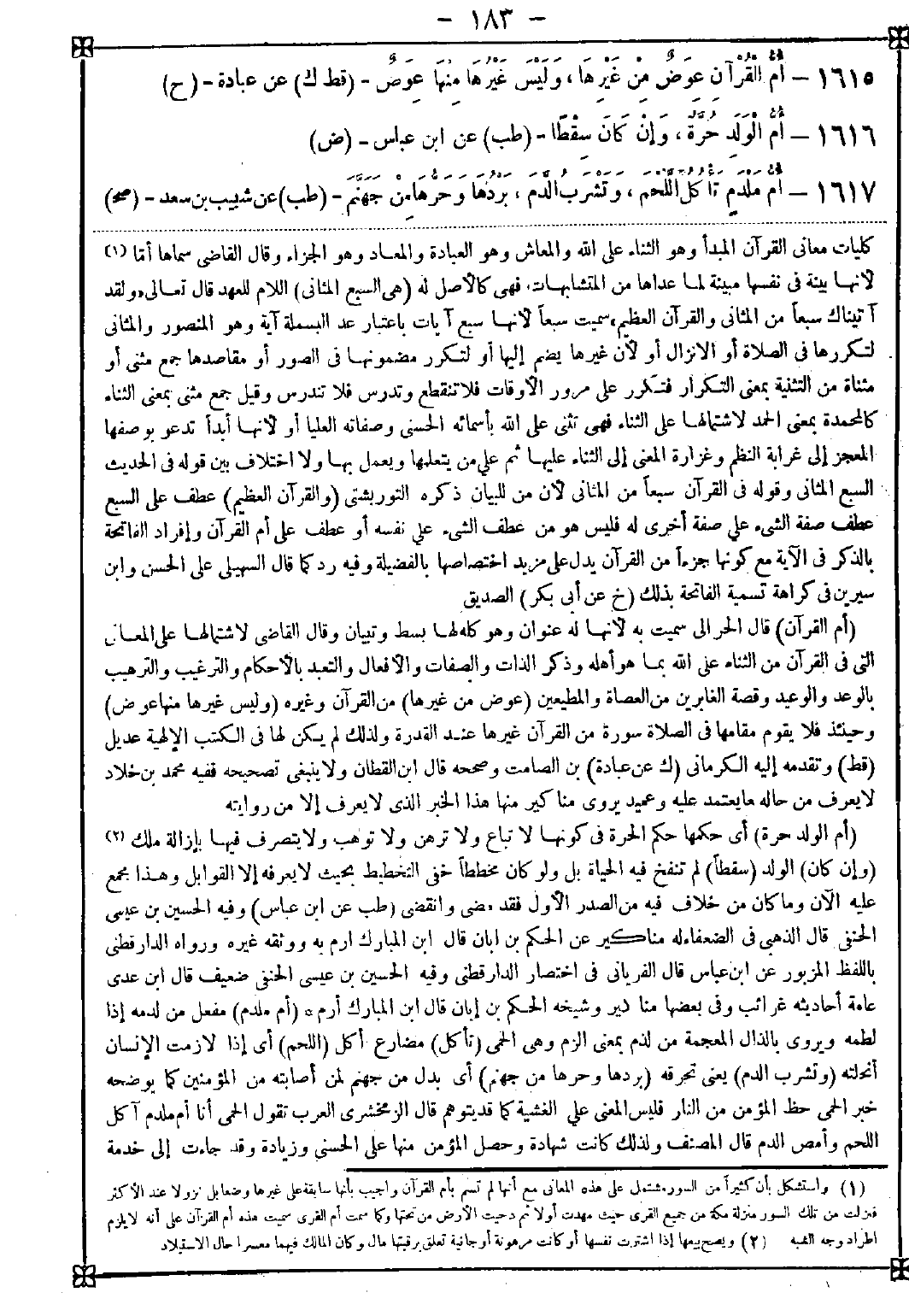 1615 - (أم القرآن) قال الحرالي سميت به لأنها له عنوان وهو كله لها بسط وتبيان وقال القاضي: لاشتمالها على المعاني التي في القرآن من الثناء على الله بما هو أهله وذكر الذات والصفات والأفعال والتعبد بالأحكام والترغيب والترهيب بالوعد والوعيد وقصة الغابرين من العصاة والمطيعين (عوض من غيرها) من القرآن وغيره (وليس غيرها منها عوض) وحينئذ فلا يقوم مقامها في الصلاة سورة من القرآن غيرها عند القدرة ولذلك لم يكن لها في الكتب الإلهية عديل