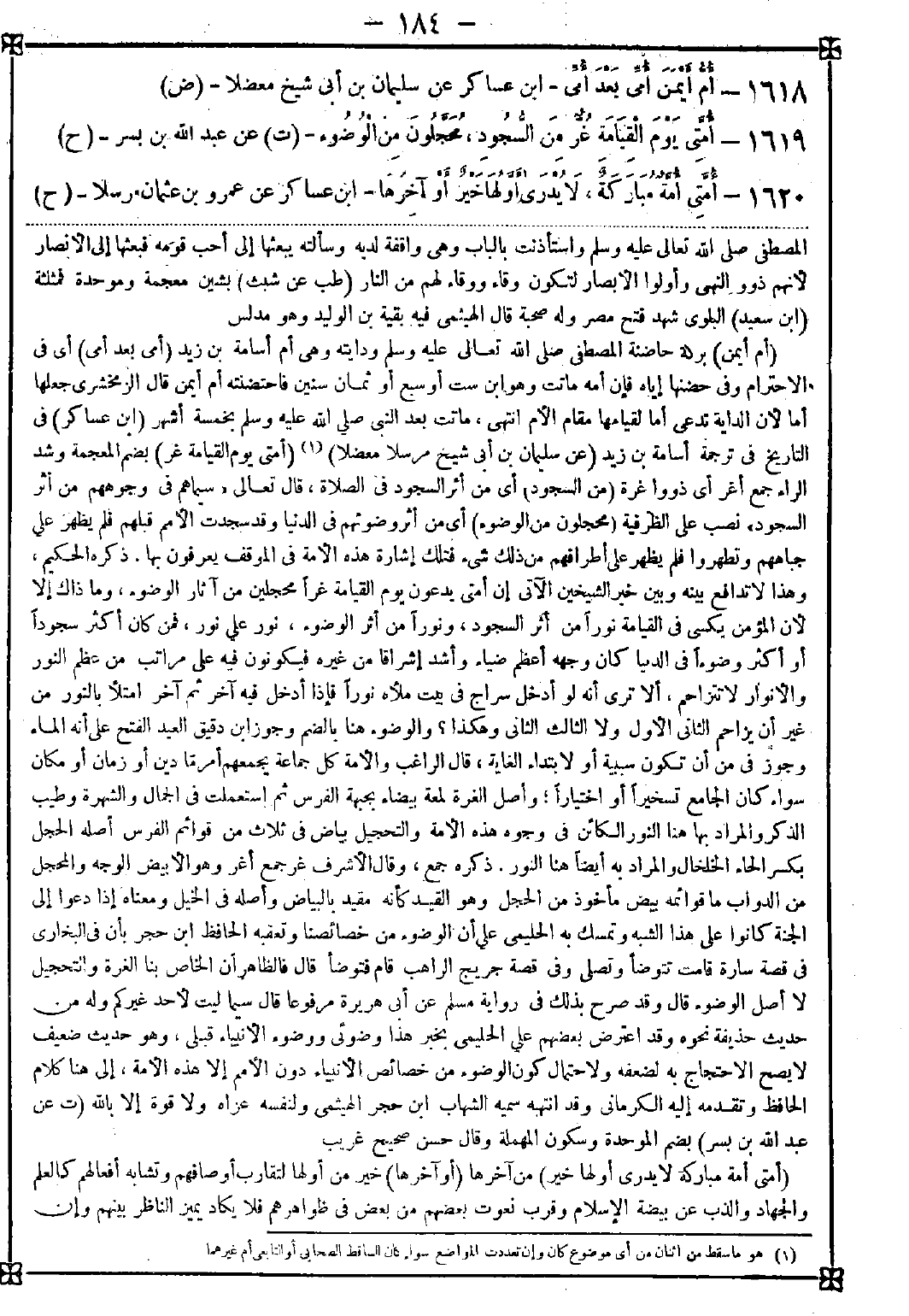 1619 - (أمتي يوم القيامة غر) بضم المعجمة وشد الراء جمع أغر أي ذووا غرة (من السجود) أي من أثر السجود في الصلاة قال تعالى {سيماهم في وجوههم من أثر السجود} نصب على الظرفية (محجلون من الوضوء) أي من أثر وضوئهم في الدنيا وقد سجدت الأمم قبلهم فلم يظهر على جباههم وتطهروا فلم يظهر على أطرافهم من ذلك شيء فتلك إشارة هذه الأمة في الموقف يعرفون بها. ذكره الحكيم وهذا لا تدافع بينه وبين خبر الشيخين الآتي إن أمتي يدعون يوم القيامة غرا محجلين من آثار الوضوء وما ذاك إلا لأن المؤمن يكسى في القيامة نورا من أثر السجود ونورا من أثر الوضوء نور على نور فمن كان أكثر سجودا أو أكثر وضوءا في الدنيا كان وجهه أعظم ضياء وأشد إشراقا من غيره فيكونون فيه على مراتب من عظم النور والأنوار لا تتزاحم ألا ترى أنه لو أدخل سراج في بيت ملأه نورا فإذا أدخل فيه آخر ثم آخر امتلأ بالنور من غير أن يزاحم الثاني الأول ولا الثالث الثاني وهكذا؟ والوضوء هنا بالضم وجوز ابن دقيق العيد الفتح على أنه الماء وجوز في من أن تكون سببية أو لابتداء الغاية قال الراغب: والأمة كل جماعة يجمعهم أمر ما دين أو زمان أو مكان سواء كان الجامع تسخيرا أو اختيارا وأصل الغرة لمعة بيضاء بجبهة الفرس ثم استعملت في الجمال والشهرة وطيب الذكر والمراد بها هنا النور الكائن في وجوه هذه الأمة والتحجيل بياض في ثلاث من قوائم الفرس أصله الحجل بكسر الحاء الخلخال والمراد به أيضا هنا النور. ذكره جمع وقال الأشرف: غر جمع أغر وهو الأبيض الوجه والمحجل من الدواب ما قوائمه بيض مأخوذ من الحجل وهو القيد كأنه مقيد بالبياض وأصله في الخيل ومعناه إذا دعوا إلى الجنة كانوا على هذا الشبه وتمسك به الحليمي على أن الوضوء من خصائصنا وتعقبه الحافظ ابن حجر بأن في البخاري في قصة سارة قامت تتوضأ وتصلي وفي قصة جريج الراهب قام فتوضأ قال: فالظاهر أن الخاص بنا الغرة والتحجيل لا أصل الوضوء قال: وقد صرح بذلك في رواية مسلم عن أبي هريرة مرفوعا قال: سيما ليت لأحد غيركم وله من حديث حذيفة نحوه وقد اعترض بعضهم على الحليمي بخبر هذا وضوئي ووضوء الأنبياء قبلي وهو حديث ضعيف لا يصح الاحتجاج به لضعفه ولاحتمال كون الوضوء من خصائص الأنبياء دون الأمم إلا هذه الأمة إلى هنا كلام الحافظ وتقدمه إليه الكرماني وقد انتهبه سميه الشهاب ابن حجر الهيثمي ولنفسه عزاه ولا قوة إلا بالله