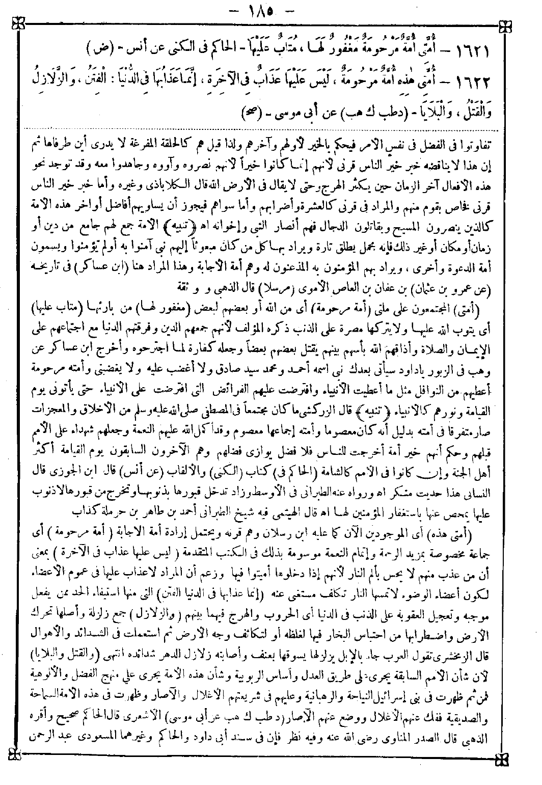 1622 - (أمتي هذه) أي الموجودين الآن كما عليه ابن رسلان وهم قرنه ويحتمل إرادة أمة الإجابة (أمة مرحومة) أي جماعة مخصوصة بمزيد الرحمة وإتمام النعمة موسومة بذلك في الكتب المتقدمة (ليس عليها عذاب في الآخرة) بمعنى أن من عذب منهم لا يحس بألم النار لأنهم إذا دخلوها أميتوا فيها وزعم أن المراد لا عذاب عليها في عموم الأعضاء لكون أعضاء الوضوء لا تمسها النار تكلف مستغنى عنه (إنما عذابها في الدنيا الفتن) التي منها استيفاء الحد ممن يفعل موجبه وتعجيل العقوبة على الذنب في الدنيا أي الحروب والهرج فيهما بينهم (والزلازل) جمع زلزلة وأصلها تحرك الأرض واضطرابها من احتباس البخار فيها لغلظه أو لتكاثف وجه الأرض ثم استعملت في الشدائد والأهوال. قال الومخشري: تقول العرب جاء بالإبل يزلزلها يسوقها بعنف وأصابته زلازل الدهر شدائده انتهى. (والقتل والبلايا) لأن شأن الأمم السابقة يجري على طريق العدل وأساس الربوبية وشأن هذه الأمة يجري على منهج الفضل والألوهية فمن ثم ظهرت في بني إسرائيل النياحة والرهبانية وعليهم في شريعتهم الأغلال والآصار وظهرت في هذه الأمة السماحة والصديقية ففك عنهم الأغلال ووضع عنهم الآصار