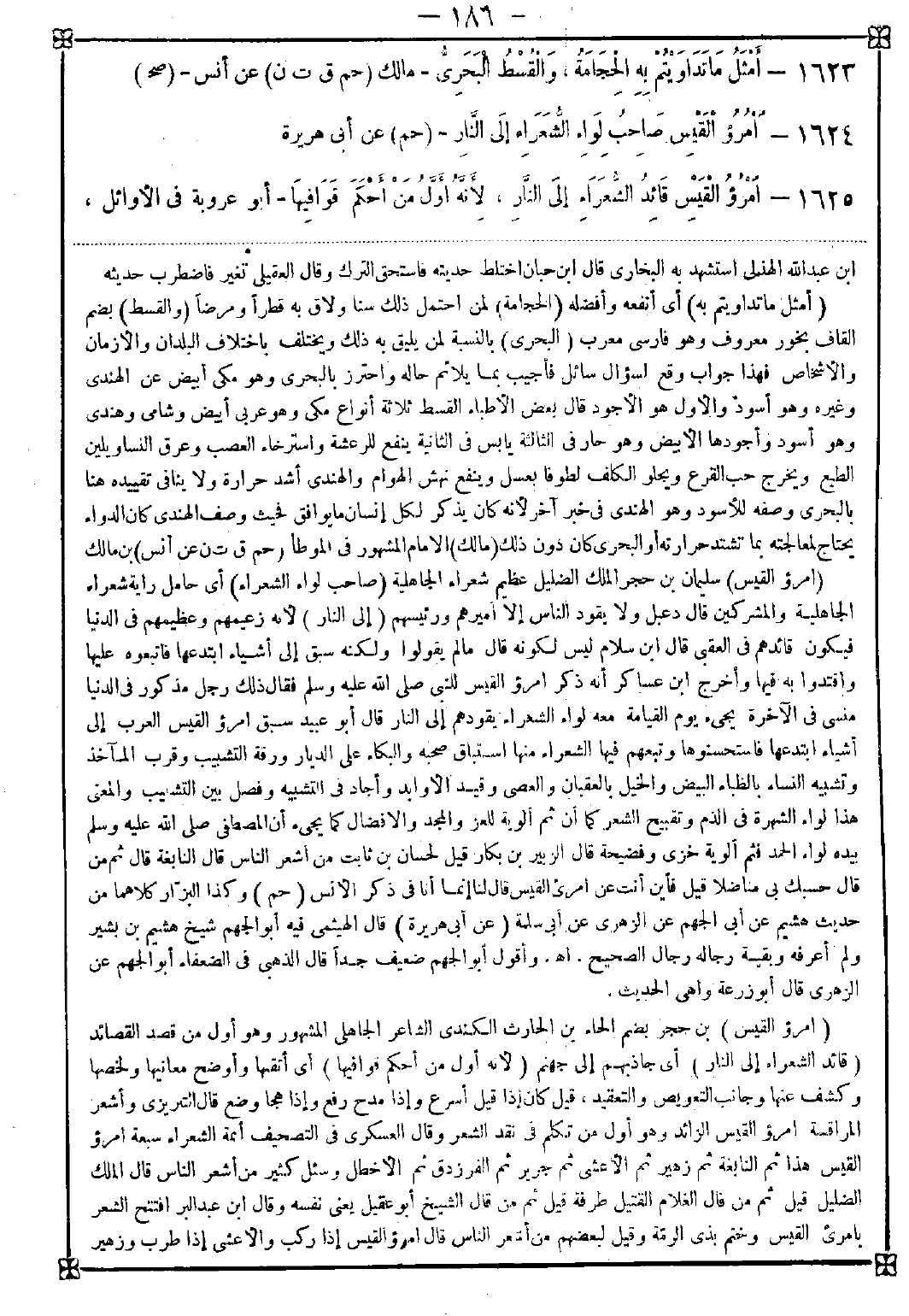 1624 - (امرؤ القيس) سليمان بن حجر الملك الضليل عظيم شعراء الجاهلية (صاحب لواء الشعر) أي حامل راية شعراء الجاهلية والمشركين. قال دعبل: ولا يقود الناس إلا أميرهم ورئيسهم (إلى النار) لأنه زعيمهم وعظيمهم في الدنيا فيكون قائدهم في العقبى. قال ابن سلام: ليس لكونه قال ما لم يقولوا ولكنه سبق إلى أشياء ابتدعها فاتبعوه عليها واقتدوا به فيها وأخرج ابن عساكر أنه ذكر امرؤ القيس للنبي صلى الله عليه وسلم فقال: ذلك رجل مذكور في الدنيا منسي في الآخرة يجيء يوم القيامة معه لواء الشعراء يقودهم إلى النار. قال أبو عبيد: سبق امرؤ القيس العرب إلى أشياء ابتدعها فاستحسنوها وتبعهم فيها الشعراء منها استباق صحبه والبكاء على الديار ورقة التشبيب وقرب المآخذ وتشبيه النساء بالظباء البيض والخيل بالعقبان والعصي وقيد الأوابد وأجاد في التشبيه وفصل بين التشبيب والمعنى هذا لواء الشهرة في الذم وتقبيح الشعر كما أن ثم ألوية للعز والمجد والإفضال كما يجيء أن المصطفى صلى الله عليه وسلم بيده لواء الحمد فثم ألوية خزي وفضيحة قال الزبير بن بكار: قيل لحسان بن ثابت من أشعر الناس قال النابغة قال ثم من قال حسبك بي مناضلا قيل فأين أنت عن امرؤ القيس قال لنا إنما أنا في ذكر الأنس