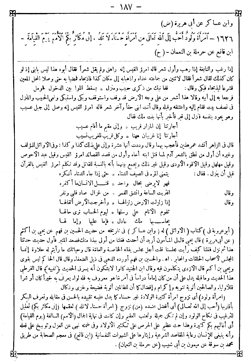 1626 - (امرأة ولود) أي تزوج امرأة كثيرة الولادة غير حسناء كما يدل عليه تقييده بالحسن في مقابله وتعرف البكر بأقاربها (أحب إلى الله تعالى) أي أفضل عنده (من) تزوج (امرأة حسناء لا تلد) لعقمها (إني مكاثر بكم) تعليل للترغيب في نكاح الولود وإن لم تكن جميلة وتجنب العقيم وإن كانت في نهاية الجمال (الأمم) السالفة (يوم القيامة) أي أغاليهم بكم كثيرة وهذا حث عظيم على الحرص على تكثير الأولاد وفي ضمنه نهى عن العزل وتوبيخ على فعله وأنه ينبغي للإنسان رعاية المقاصد الشرعية وإيثارها على الشهوات النفسانية
