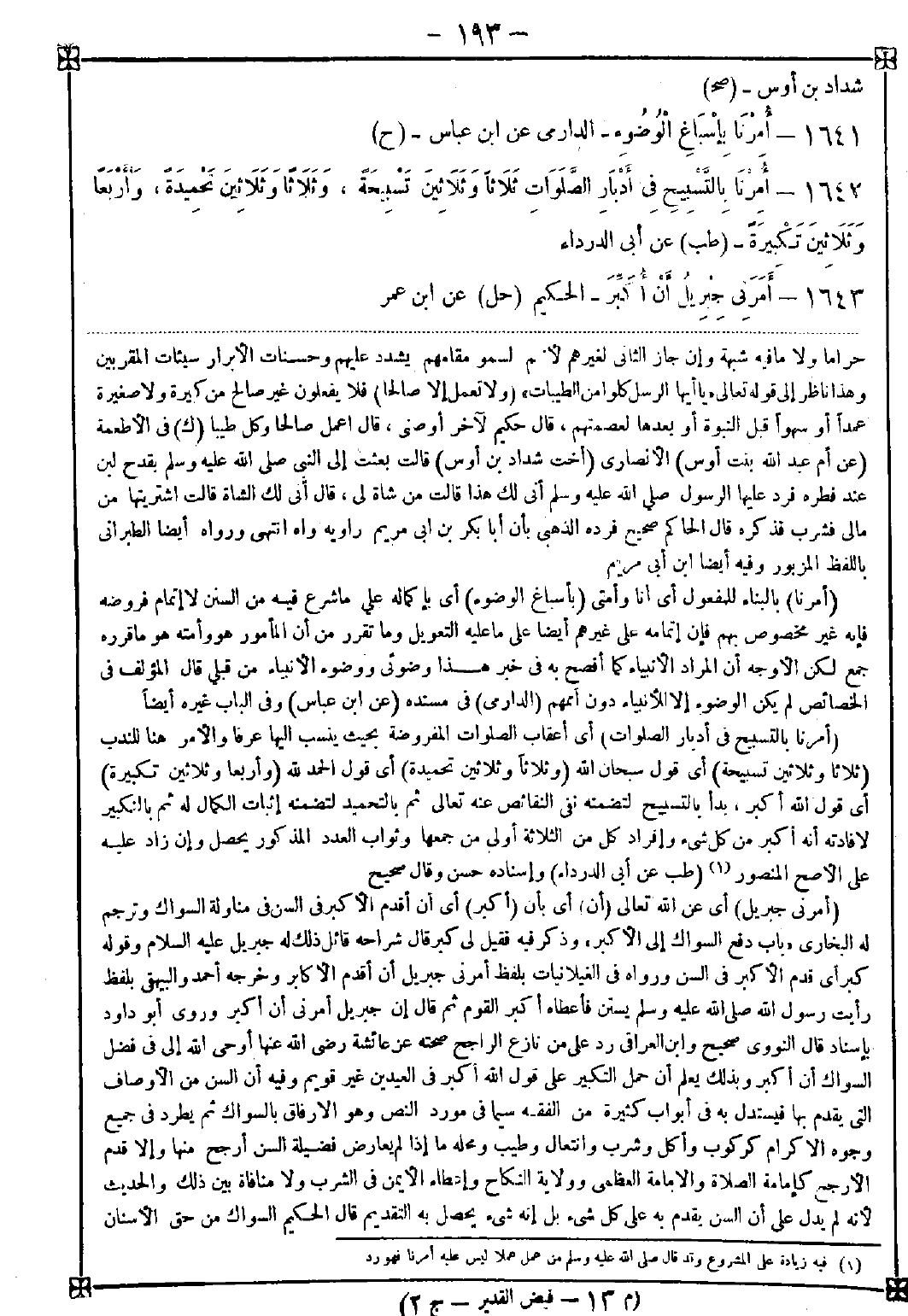 1643 - (أمرني جبريل) أي عن الله تعالى (أن) أي بأن (أكبر) أي أن أقدم الأكبر في السن في مناولة السواك وترجم له البخاري " باب دفع السواك إلى الأكبر " وذكر فيه فقيل لي كبر قال شراحه قائل ذلك جبريل عليه السلام وقوله كبر أي قدم الأكبر في السن ورواه في الغيلانيات بلفظ أمرني جبريل أن أقدم الأكابر وخرجه أحمد والبيهقي بلفظ رأيت رسول الله صلى الله عليه وسلم يستن فأعطاه أكبر القوم ثم قال إن جبريل أمرني أن أكبر وروى أبو داود بإسناد قال النووي صحيح وابن العراقي رد على من نازع الراجح صحته عن عائشة رضي الله عنها أوحي الله إلي في فضل السواك أن أكبر وبذلك يعلم أن حمل التكبير على قول الله أكبر في العيدين غير قويم وفيه أن السن من الأوصاف التي يقدم بها فيستدل به في أبواب كثيرة من الفقه سيما في مورد النص وهو الإرفاق بالسواك ثم يطرد في جميع وجوه الإكرام كركوب وأكل وشرب وانتعال وطيب ومحله ما إذا لم يعارض فضيلة السن أرجح منها وإلا قدم الأرجح كإمامة الصلاة والإمامة العظمى وولاية النكاح وإعطاء الأيمن في الشرب ولا منافاة بين ذلك والحديث لأنه لم يدل على أن السن يقدم به على كل شيء بل إنه شيء يحصل به التقديم قال الحكيم: السواك من حق الأسنان. -[194]- لأنه يشد اللثة ويذهب الحفر فأكبرهم سنا أقدمهم خروج أسنان ومن كان أقدم فهو أحق