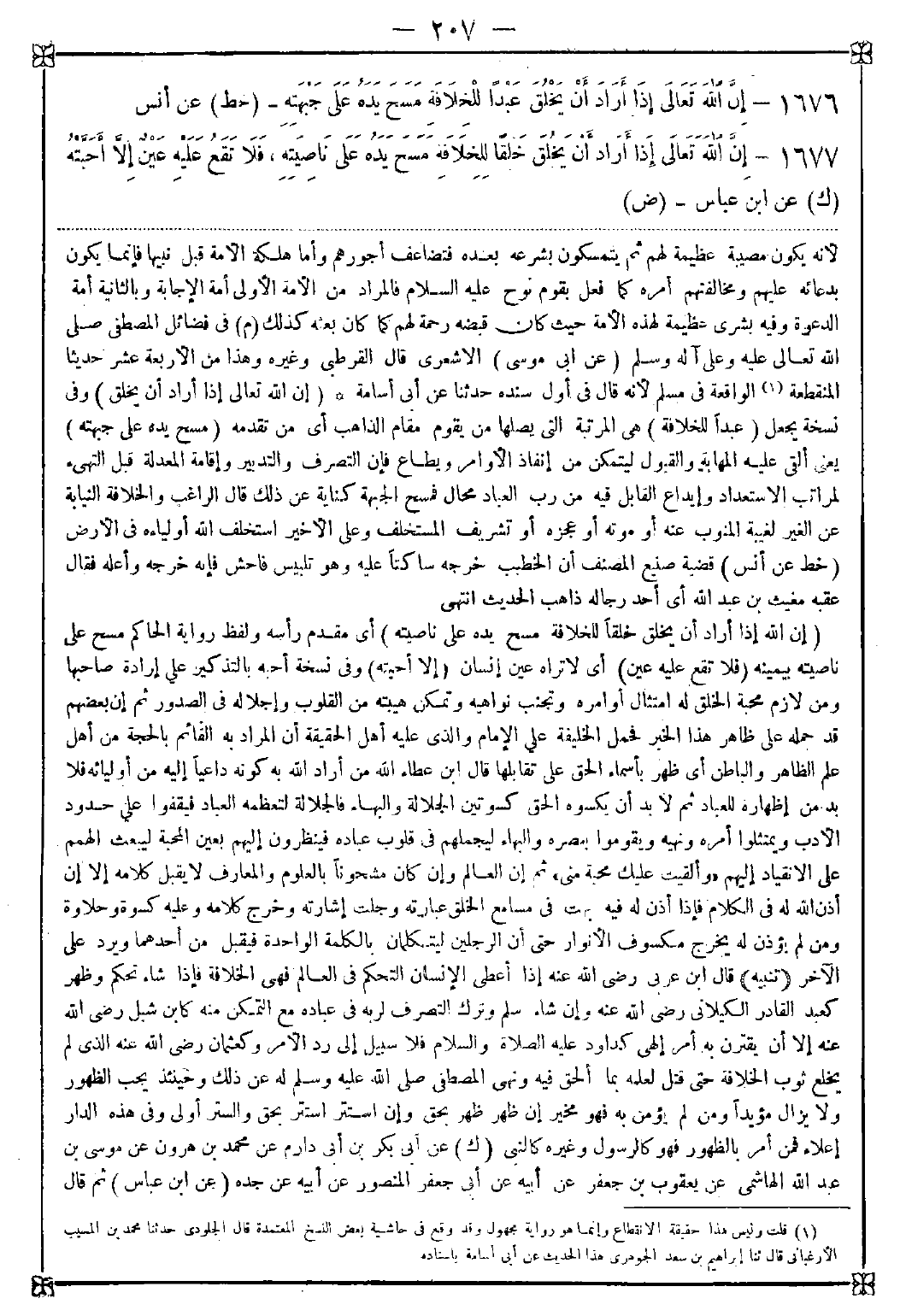 1677 - (إن الله إذا أراد أن يخلق خلقا للخلافة مسح يده على ناصيته) أي مقدم رأسه ولفظ رواية الحاكم مسح على ناصيته بيمينه (فلا تقع عليه عين) أي لا تراه عين إنسان (إلا أحبته) وفي نسخة أحبه بالتذكير على إرادة صاحبها ومن لازم محبة الخلق له امتثال أوامره وتجنب نواهيه وتمكن هيبته من القلوب وإجلاله في الصدور. ثم إن بعضهم قد حمله على ظاهر هذا الخبر فحمل الخليفة على الإمام والذي عليه أهل الحقيقة أن المراد به القائم بالحجة من أهل علم الظاهر والباطن أي ظهر بأسماء الحق على تقابلها قال ابن عطاء الله: من أراد الله به كونه داعيا إليه من أوليائه فلا بد من إظهاره للعباد ثم لا بد أن يكسوه الحق كسوتين الجلالة والبهاء فالجلالة لتعظمه العباد فيقفوا على حدود الأدب ويمتثلوا أمره ونهيه ويقوموا بنصره والبهاء ليجملهم في قلوب عباده فينظرون إليهم بعين المحبة ليبعث الهمم على الانقياد إليهم {وألقيت عليك محبة مني} ثم إن العالم وإن كان مشحونا بالعلوم والمعارف لا يقبل كلامه إلا إن أذن الله له في الكلام فإذا أذن له فيه بهت في مسامع الخلق عبارته وجلت إشارته وخرج كلامه وعليه كسوة وحلاوة ومن لم يؤذن له يخرج مكسوف الأنوار حتى أن الرجلين ليتكلمان بالكلمة الواحدة فيقبل من أحدهما ويرد على الآخر <تنبيه> قال ابن عربي رضي الله عنه: إذا أعطي الإنسان التحكم في العالم فهي الخلافة فإذا شاء تحكم وظهر كعبد القادر الكيلاني رضي الله عنه وإن شاء سلم وترك التصرف لربه في عباده مع التمكن منه كابن شبل رضي الله عنه إلا أن يقترن به أمر إلهي كداود عليه الصلاة والسلام فلا سبيل إلى رد الأمر وكعثمان رضي الله عنه الذي لم يخلع ثوب الخلافة حتى قتل لعلمه بما ألحق فيه ونهي المصطفى صلى الله عليه وسلم له عن ذلك وحينئذ يجب الظهور ولا يزال مؤيدا ومن لم يؤمن به فهو مخير إن ظهر ظهر بحق وإن استتر استتر بحق والستر أولى وفي هذه الدار إعلاء فمن أمر بالظهور فهو كالرسول وغيره كالنبي