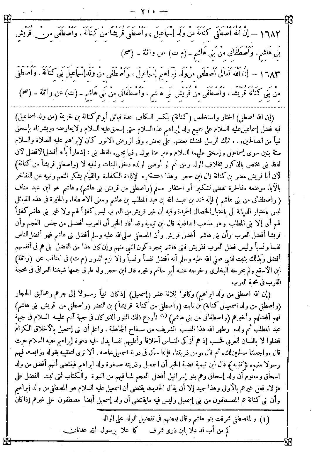 1683 - (إن الله اصطفى من ولد إبراهيم) وكانوا ثلاثة عشر (إسماعيل) إذ كان نبيا رسولا إلى جرهم وعماليق الحجاز (واصطفى من ولد إسماعيل كنانة) بن ثابت (واصطفى من كنانة قريشا) بن النضر (واصطفى من قريش بني هاشم) فهو أفضلهم وأخيرهم (واصطفاني من بني هاشم) (1) . فأودع ذلك النور الذي كان في جبهة آدم عليه السلام في جبهة عبد المطلب ثم ولده وطهر الله هذا النسب الشريف من سفاح الجاهلية. واعلم أن بني إسماعيل بالأخلاق الكرام فضلوا لا باللسان العربي فحسب إذ هم أزكى الناس أخلاقا وأطيبهم نفسا يدل عليه دعوة إبراهيم عليه السلام حيث قال {واجعلنا مسلمين لك} ثم قال {ومن ذريتنا} فإنما سأل في ذرية إسماعيل خاصة. ألا ترى لتعقيبه بقوله {وابعث فيهم رسولا منهم} <تنبيه> قال ابن تيمية: قضية الخبر أن إسماعيل وذريته صفوة ولد إبراهيم فيقتضي أنهم أفضل من ولد إسحاق ومعلوم أن ولد إسحاق وهم بنو إسرائيل أفضل العجم لما فيهم من النبوة والكتاب فمتى ثبت الفضل على هؤلاء فعلى غيرهم بالأولى وهذا جيد إلا أن يقال الحديث يقتضي أن إسماعيل عليه السلام هو المصطفى من ولد إبراهيم وأن بني كنانة هم المصطفون من بني إسماعيل وليس فيه ما يقتضي أن ولد إسماعيل أيضا مصطفون على غيرهم إذا كان -[211]- أبوهم مصطفى وبعضهم مصطفى على بعض فيقال لو لم يكن ذا مقصود لم يكن لذكر اصطفاء إسماعيل فائدة إذ كان اصطفاؤه لم يدل على اصطفاء ذريته إذ على هذا التقدير لا فرق بين ذكر إسماعيل وذكر إسحاق