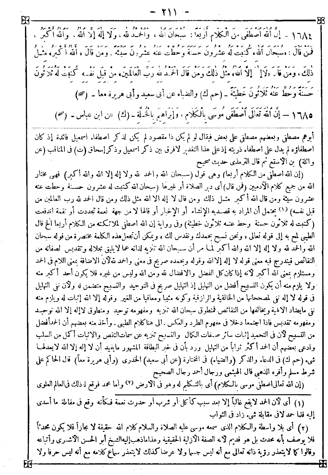 1685 - (إن الله تعالى اصطفى موسى بالكلام) أي بالتكليم له وهو في الأرض (1) وأما محمد فوقع له ذلك في العالم العلوي -[212]- فتلك هي المختصة بموسى. ذكره بعض المحققين (وإبراهيم بالخلة) أي بكرامة تشبه كرامة الخليل عند خليله كما مر ذلك مبينا