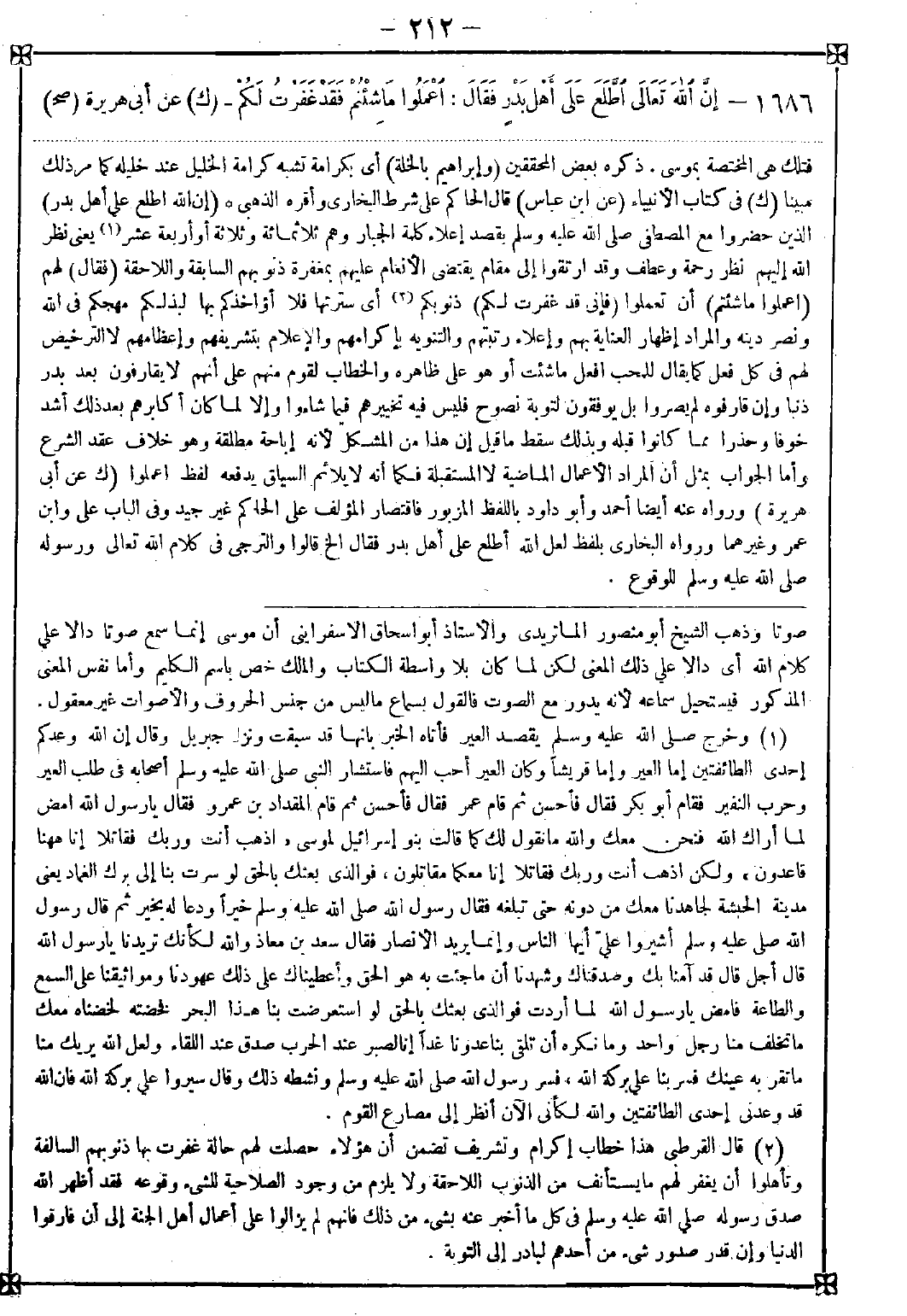 1686 - (إن الله اطلع على أهل بدر) الذين حضروا مع المصطفى صلى الله عليه وسلم بقصد إعلاء كلمة الجبار وهم ثلاث مئة وثلاثة أو أربعة عشر رجل (1) يعني نظر الله إليهم نظرة رحمة وعطف وقد ارتقوا إلى مقام يقتضي الإنعام عليهم بمغفرة ذنوبهم السابقة واللاحقة (فقال) لهم (اعملوا ما شئتم) أن تعملوا (فإني قد غفرت لكم) ذنوبكم (2) أي سترتها فلا أؤاخذكم بها لبذلكم مهجكم في الله ونصر دينه والمراد إظهار العناية بهم وإعلاء رتبتهم والتنويه بإكرامهم والإعلام بتشريفهم وإعظامهم لا الترخيص لهم في كل فعل كما يقال للمحب افعل ما شئت أو هو على ظاهره والخطاب لقوم منهم على أنهم لا يقارفون بعد بدر ذنبا وإن قارفوه لم يصروا بل يوفقون لتوبة نصوح فليس فيه تخييرهم فيما شاؤوا وإلا لما كان أكابرهم بعد ذلك أشد خوفا وحذرا مما كانوا قبله وبذلك سقط ما قيل إن هذا سقط من المشكل لأنه إباحة مطلقة وهو خلاف عقد الشرع وأما الجواب بمثل أن المراد الأعمال الماضية لا المستقبلة فكما أنه لا يلائم السياق يدفعه لفظ اعملوا