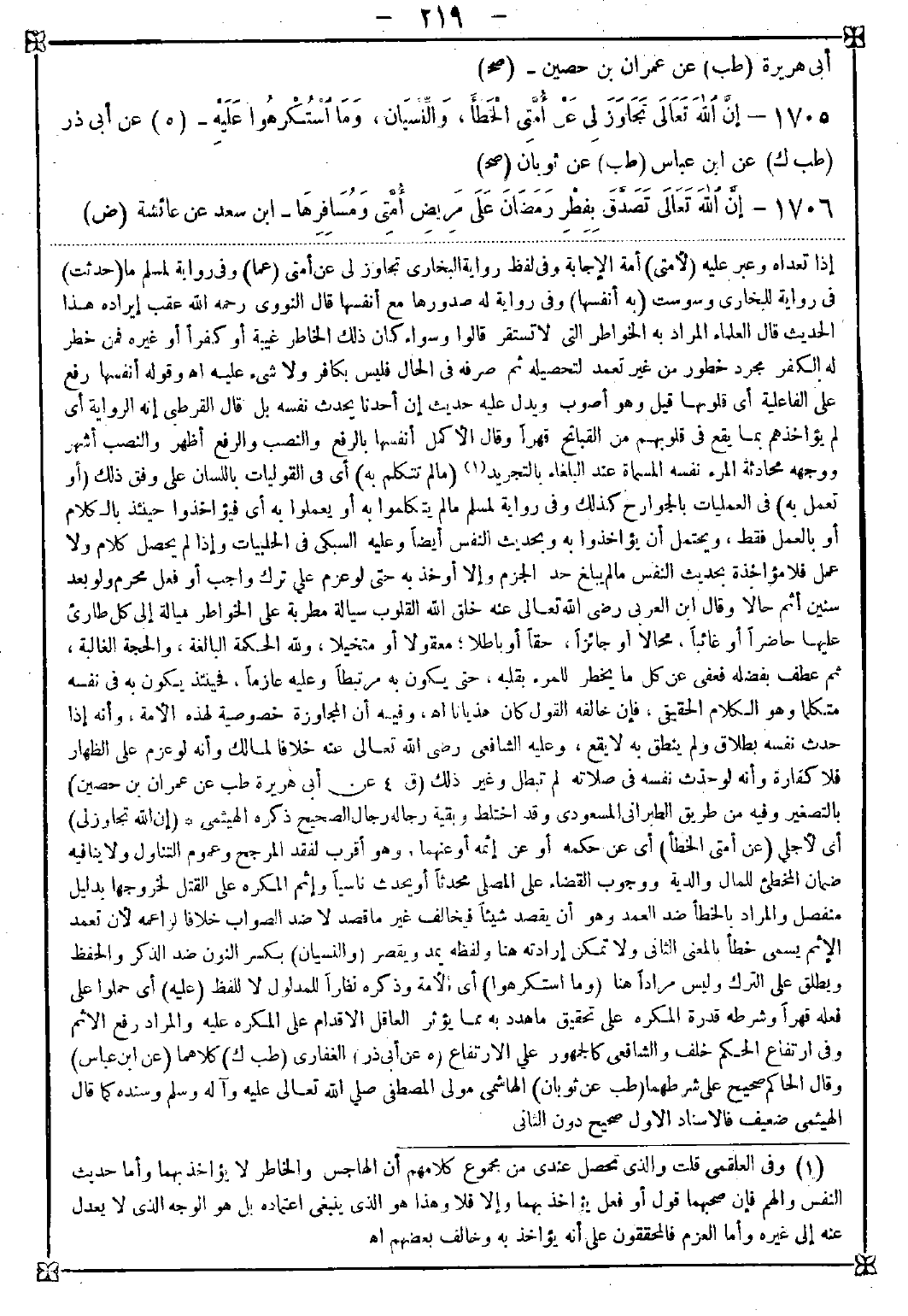 1705 - (إن الله تجاوز لي) أي لأجلي (عن أمتي الخطأ) أي عن حكمه أو عن إثمه أو عنهما. وهو أقرب لفقد المرجح وعموم التناول ولا ينافيه ضمان المخطئ للمال والدية ووجوب القضاء على المصلي محدثا أو يحدث ناسيا وإثم المكره على القتل لخروجها بدليل منفصل والمراد بالخطأ ضد العمد وهو أن يقصد شيئا فيخالف غير ما قصد لا ضد الصواب خلافا لزاعمه لأن تعمد الإثم يسمى خطئا بالمعنى الثاني ولا تمكن إرادته هنا ولفظه يمد ويقصر (والنسيان) بكسر النون ضد الذكر والحفظ ويطلق على الترك وليس مرادا هنا (وما استكرهوا) أي الأمة وذكره نظرا للمدلول لا للفظ (عليه) أي حملوا على فعله قهرا وشرطه قدرة المكره على تحقيق ما هدد به مما يؤثر العاقل الإقدام على المكره عليه والمراد رفع الإثم وفي ارتفاع الحكم خلف والشافعي في الجمهور على الارتفاع