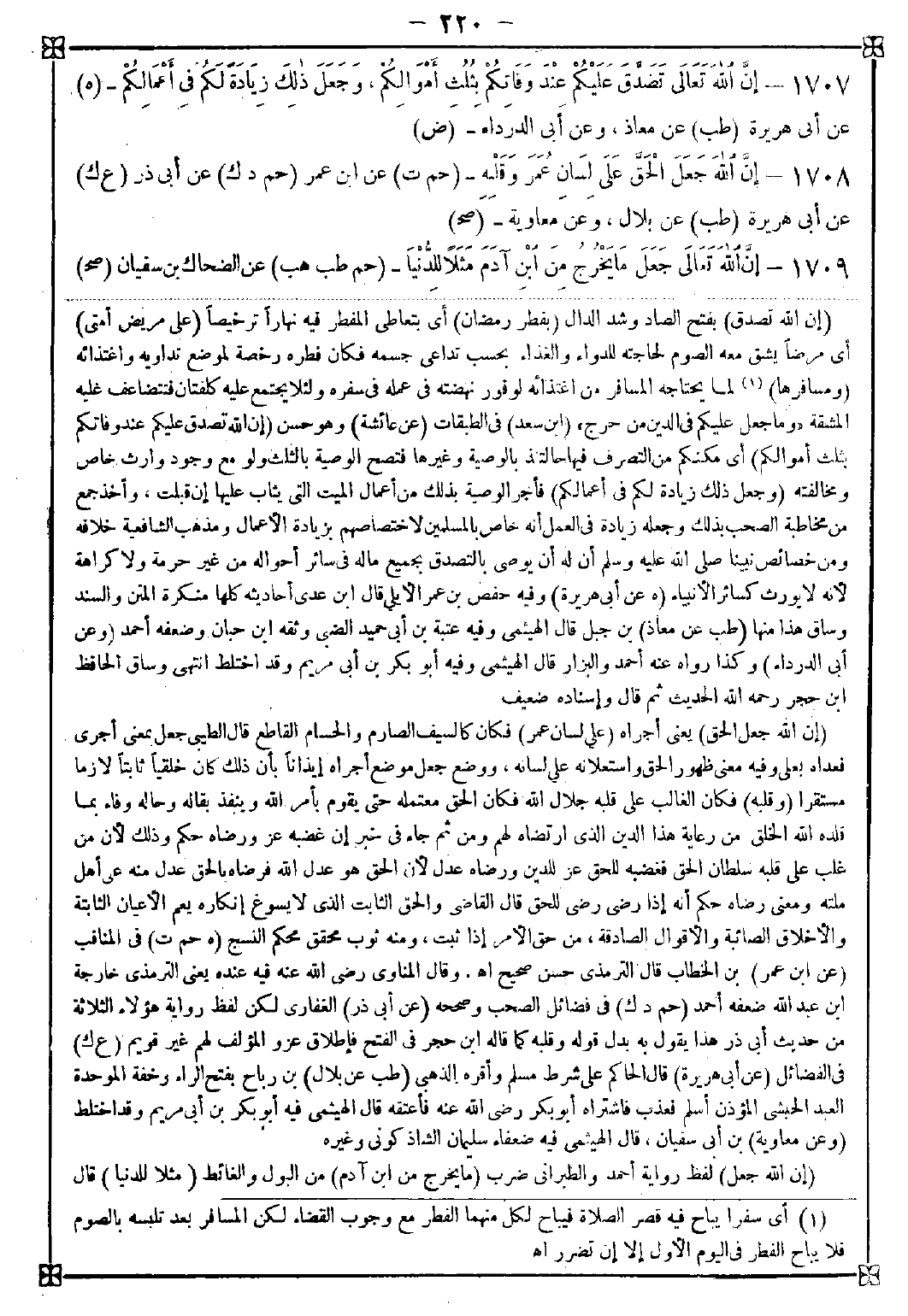-[220]- 1706 - (إن الله تصدق) بفتح الصاد وشد الدال (بفطر رمضان) أي يتعاطى المفطر فيه نهارا ترخيصا (على مريض أمتي) أي مرضا يشق معه الصوم لحاجته للدواء والغذاء بحسب تداعي جسمه فكان فطره رخصة لموضع تداويه واغتذائه (ومسافرها) (1) لما يحتاجه المسافر من اغتذائه لوفور نهضته في عمله في سفره ولئلا يجتمع عليه كلفتان فتتضاعف عليه المشقة {وما جعل عليكم في الدين من حرج}