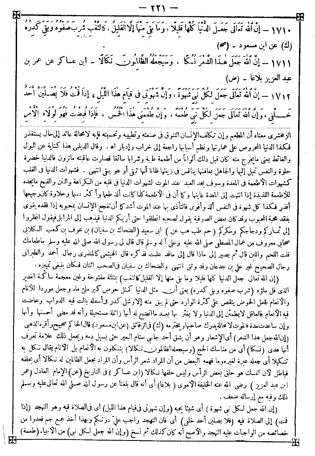 1712 - (إن الله جعل لكل نبي شهوة) أي شيئا يحبه (وإن شهوتي في قيام هذا الليل) أي في الصلاة فيه وهو التهجد (إذا قمت) إلى الصلاة فيه (فلا يصلين أحد خلفي) أي فإن التهجد واجب علي دونكم وبهذا أخذ جمع جم فعدوا من خصائصه من الواجبات عليه التهجد والأصح أنه كان كذلك ثم نسخ (وإن الله جعل لكل نبي) من الأنبياء (طعمة) -[222]- بالضم أي رزقا (وإن طعمتي) جعلها الله (هذا الخمس) من الفيء والغنيمة (فإذا قبضت) بالبناء للمجهول أي قبضني الله أي أماتني (فهو) أي الخمس (لولاة الأمر من بعدي) جمع وال وهو من ولي أمورهم من الخلفاء فمن دونهم وقد سبق تقريره موضحا