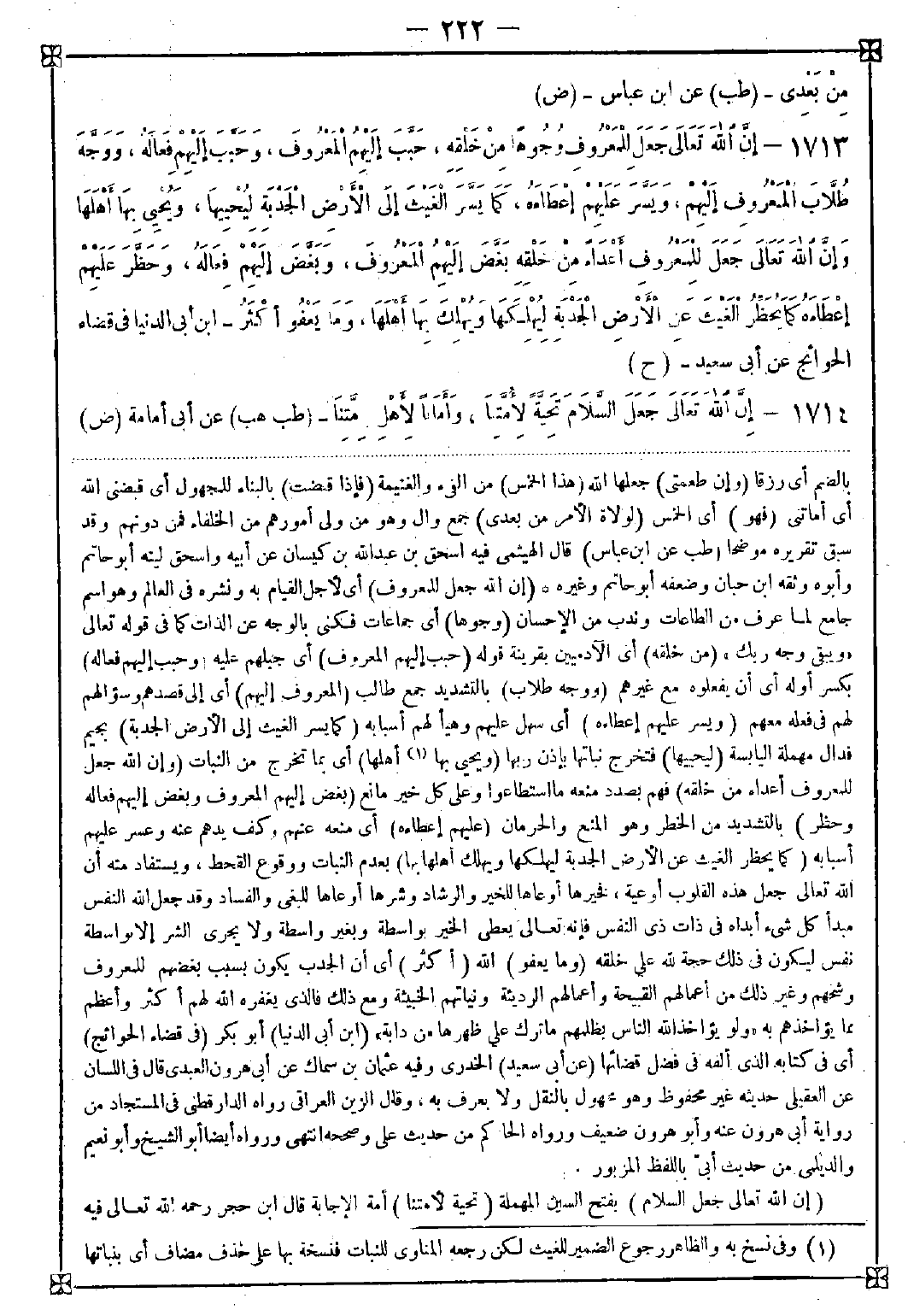 1713 - (إن الله جعل للمعروف) أي لأجل القيام به ونشره في العالم وهو اسم جامع لما عرف من الطاعات وندب من الإحسان (وجوها) أي جماعات فكنى بالوجه عن الذات كما في قوله تعالى {ويبقى وجه ربك} (من خلقه) أي الآدميين بقرينة قوله (حبب إليهم المعروف) أي جبلهم عليه (وحبب إليهم فعاله) بكسر أوله أي أن يفعلوه مع غيرهم (ووجه طلاب) بالتشديد جمع طالب (المعروف إليهم) أي إلى قصدهم وسؤالهم لهم في فعله معهم (ويسر عليهم إعطاءه) أي سهل عليهم وهيأ لهم أسبابه (كما يسر الغيث إلى الأرض الجدبة) بجيم فدال مهملة اليابسة (ليحييها) فتخرج نباتها بإذن ربها (ويحيي بها (1) أهلها) أي بما تخرج من النبات (وإن الله جعل للمعروف أعداء من خلقه) فهم بصدد منعه ما استطاعوا وعلى كل خير مانع (بغض إليهم المعروف وبغض إليهم فعاله وحظر) بالتشديد من الحظر وهو المنع والحرمان (عليهم إعطاءه) أي منعه عنهم وكف يدهم عنه وعسر عليهم أسبابه (كما يحظر الغيث عن الأرض الجدبة ليهلكها ويهلك أهلها بها) بعدم النبات ووقوع القحط ويستفاد منه أن الله تعالى جعل هذه القلوب أوعية فخيرها أوعاها للخير والرشاد وشرها أوعاها للبغي والفساد وقد جعل الله النفس مبدأ كل شيء أبداه في ذات ذي النفس فإنه تعالى يعطي الخير بواسطة وبغير واسطة ولا يجري الشر إلا بواسطة نفس ليكون في ذلك حجة لله على خلقه (وما يعفو) الله (أكثر) أي أن الجدب يكون بسبب بغضهم للمعروف وشحهم وغير ذلك من أعمالهم القبيحة وأعمالهم الرديئة ونياتهم الخبيثة ومع ذلك فالذي يغفره الله لهم أكثر وأعظم مما يؤاخذهم به {ولو يؤاخذ الله الناس بظلمهم ما ترك على ظهرها من دابة}