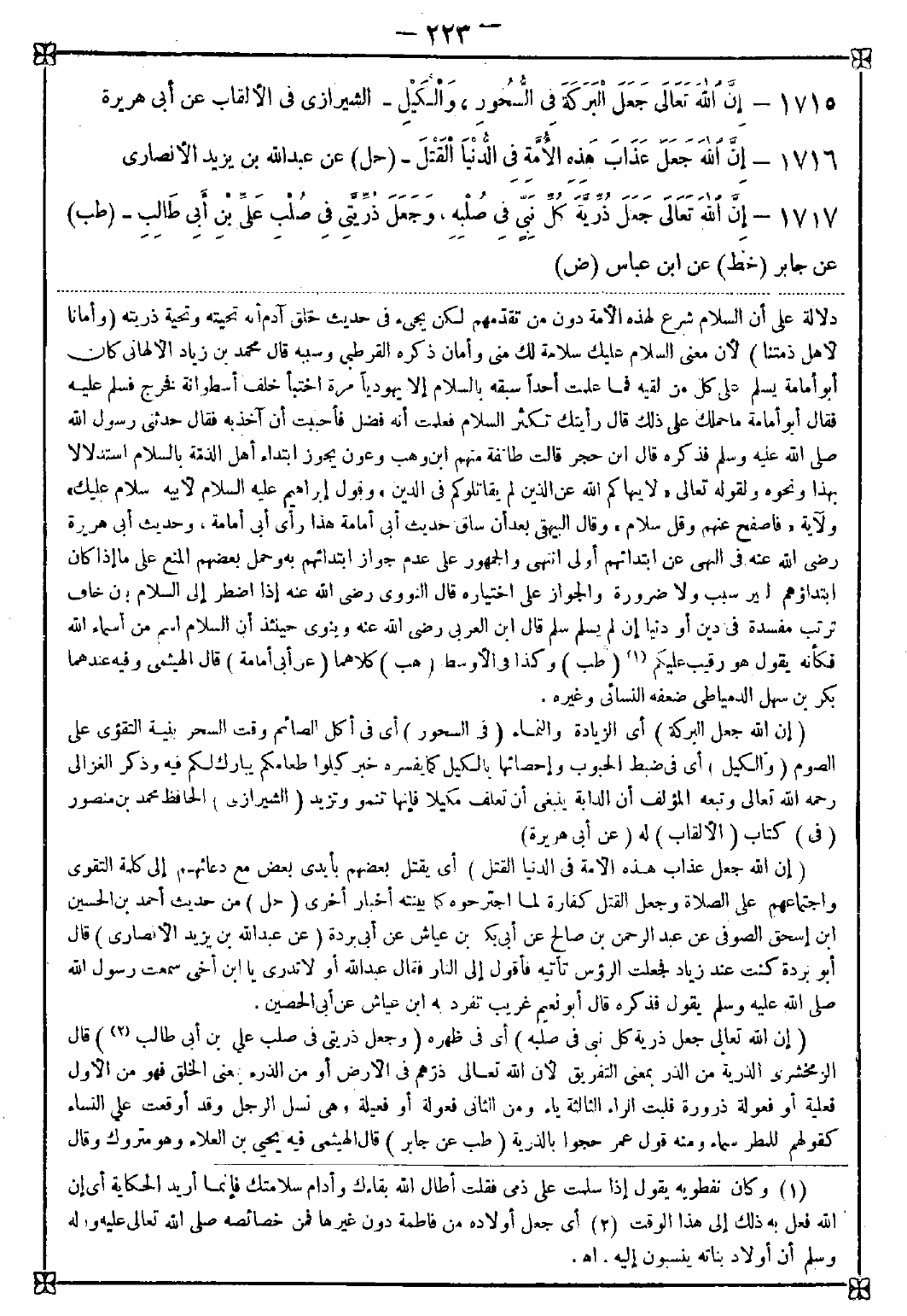 1716 - (إن الله جعل عذاب هذه الأمة في الدنيا القتل) أي يقتل بعضهم بأيدي بعض مع دعائهم إلى كلمة التقوى واجتماعهم على الصلاة وجعل القتل كفارة لما اجترحوه كما بينته أخبار أخرى