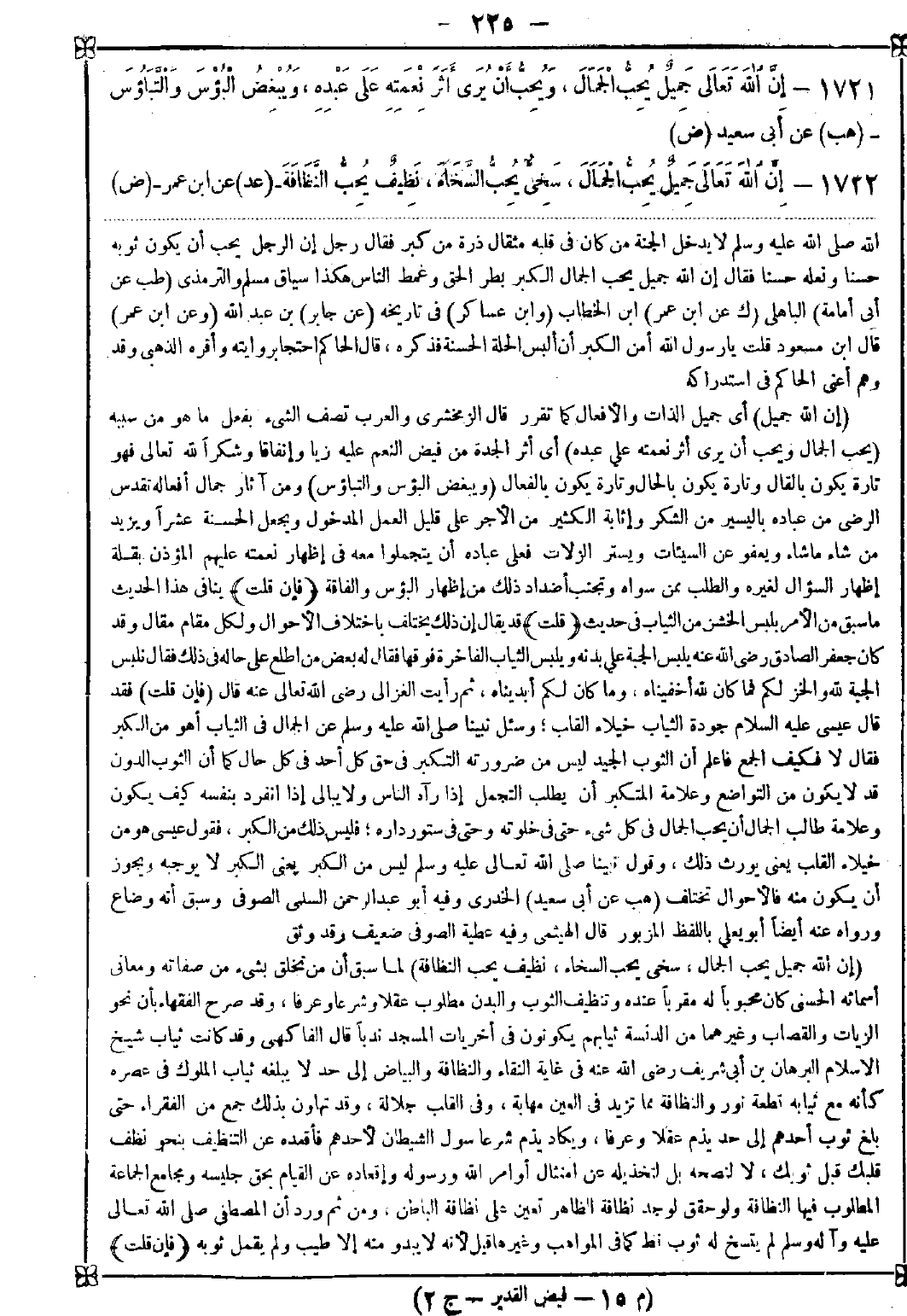 1722 - (إن الله جميل يحب الجمال سخي يحب السخاء نظيف يحب النظافة) لما سبق أن من تخلق بشيء من صفاته ومعاني أسمائه الحسنى كان محبوبا له مقربا عنده وتنظيف الثوب والبدن مطلوب عقلا وشرعا وعرفا وقد صرح الفقهاء بأن نحو الزيات والقصاب وغيرهما من الدنسة ثيابهم يكونون في أخريات المسجد ندبا قال الفاكهي: وقد كانت ثياب شيخ الإسلام البرهان بن أبي شريف رضي الله عنه في غاية النقاء والنظافة والبياض إلى حد لا يبلغه ثياب الملوك في عصره كأنه مع ثيابه قطعة نور والنظافة مما تزيد في العين مهابة وفي القلب جلالة وقد تهاون بذلك جمع من الفقراء حتى بلغ ثوب أحدهم إلى حد يذم عقلا وعرفا ويكاد يذم شرعا سول الشيطان لأحدهم فأقمده عن التنظيف بنحو نظف قلبك قبل ثوبك لا لنصحه بل لتخذيله عن امتثال أوامر الله ورسوله وإقعاده عن القيام بحق جليسه ومجامع الجماعة المطلوب فيها النظافة ولو حقق لوجد نظافة الظاهر تعين على نظافة الباطن ومن ثم ورد أن المصطفى صلى الله تعالى عليه وآله وسلم لم يتسخ له ثوب قط كما في المواهب وغيرها قيل لأنه لا يبدو منه إلا طيب ولم يقمل ثوبه (فإن قلت) -[226]- ما سبب تعبيره في هذه الثلاثة بالجمال دون الحسن (فالجواب) أن الحسن إنما يوصف به ما كان مفردا نحو خاتم حسن فإذا اجتمع من ذلك جمل وصف صاحبها بالجمال فالحسن يتعلق بالمفردات والجمال بالمركبات الجمليات ذكره السهيلي وغيره