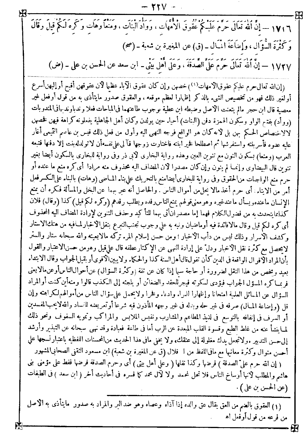 -[227]- 1726 - (إن الله تعالى حرم عليكم عقوق الأمهات (1)) خصهن وإن كان عقوق الآباء عظيما لأن عقوقهن أقبح أو إليهن أسرع أو لغير ذلك فهو من تخصيص الشيء بالذكر إظهارا لعظم موقعه والعقوق صدور ما يتأذى به من قول أو فعل غير معصية. قال ابن حجر: ما لم يتعنت الأصل وضبطه ابن عطية بوجوب طاعتهما في المباحات فعلا وندبا وندبها في المندوبات (ووأد) بفتح الواو وسكون الهمزة دفن (البنات) أحياء حين يولدن وكان أهل الجاهلية يفعلونه كراهة فيهن فخصهن لا لاختصاص الحكم بهن بل لأنه كان هو الواقع فوجه النهي إليه وأول من فعل ذلك قيس بن عاصم التميمي أغار عليه عدوه فأسر بنته واستفرشها ثم اصطلحا فخير ابنته فاختارت زوجها فآلى على نفسه أن لا تولد له بنت إلا دفنها فتبعه العرب (ومنعا) بسكون النون مع تنوين العين وهذه رواية البخاري لأبي ذر وفي رواية للبخاري بالسكون أيضا بغير تنوين. قال البيضاوي: وإنما لم ينون وإن كان مصدرا لأن المضاف إليه محذوف منه مرادا أي كره منع ما عنده أو حرم منع الواجبات من الحقوق وفي رواية للبخاري أيضا منع بالتحريك على بناء الماضي (وهات) بالبناء على الكسر فعل أمر من الإيتاء: أي حرم أخذ ما لا يحل من أموال الناس. والحاصل أنه عبر بهما عن البخل والمسألة فكره أن يمنع الإنسان ما عنده ويسأل ما عند غيره وهو معنى قولهم يمنع الناس رفده ويطلب رفدهم (وكره لكم قيل) كذا (وقال) فلان كذا مما يتحدث به من فضول الكلام فهما إما مصدران أتى بهما للتأكيد وحذف التنوين لإرادة المضاف إليه المحذوف أي كره لكم قيل وقال ما لا فائدة فيه أو ماضيان ونبه به على وجوب تجنب التبرع بنقل الأخبار لما فيه من هتك الأستار وكشف الأسرار وذلك ليس من دأب الأخيار ومن حسن إسلام المرء تركه ما لا يعنيه والله سبحانه ستار والستر لا يحصل مع كثرة نقل الأخبار ودل على إرادة النهي عن الإكثار عطفه قال علي قيل وهو من حسن الاعتبار والقول بأن المراد الأقوال الواقعة في الدين كأن تقول قال أهل السنة كذا والحكماء ولا يبين الأقوى أو بقيل الجواب وقال الابتداء بعيد ويخص من هذا النقل لضرورة أو حاجة سيما إذا كان عن ثقة (وكثرة السؤال) عن أحوال الناس أو عن ما لا يعني فربما كره المسؤول الجواب فيؤدي لسكوته فيجر للحقد والضغائن أو يلجئه إلى الكذب قالوا ومنه أين كنت أو المراد السؤال عن المسائل العلمية امتحانا وإظهارا للمراء وادعاء وفخرا ولا يحمل على سؤال الناس من أموالهم لكراهته وإن قل (وإضاعة المال) صرفه في غير حله وبذله في غير وجهه المأذون فيه شرعا أو تعريضه للفساد والله لا يحب المفسدين أو السرف في إنفاقه بالتوسع في لذيذ المطاعم والمشارب ونفيس الملابس والمراكب وتمويه السقوف ونحو ذلك لما ينشأ عنه من غلط الطبع وقسوة القلب المبعدة عن الرب أما في طاعة فعبادة وقد نهى سبحانه عن التبذير وأرشد إلى حسن التدبير {ولا تجعل يدك مغلولة إلى عنقك} ولا يخفى ما في هذا الحديث من المحسنات اللفظية باعتبار نسجها على أحسن منوال وكثرة معانيها مع ما في اللفظ من الإقلال