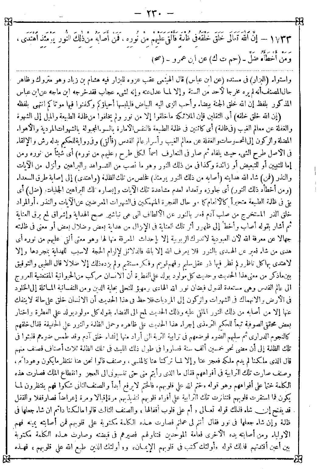 1733 - (إن الله خلق خلقه) أي الثقلين فإن الملائكة ما خلقوا إلا من نور ولم يخلقوا من ظلمة الطبيعة والميل إلى الشهوة والغفلة عن معالم الغيب (في ظلمة) أي كائنين في ظلمة الطبيعة فالنفس الأمارة بالسوء المجبولة بالشهوات المردية والأهواء المضلة والركون إلى المحسوسات والغفلة عن معالم الغيب وأسرار عالم القدس (فألقى) وفي رواية للحكيم بدله رش والإلقاء في الأصل طرح الشيء حيث يلقاه ثم صار في التعارف إسما لكل طرح (عليهم من نوره) أي شيئا من نوره ومن إما للتبيين أو للتبعيض أو زائدة وكذا في من ذلك النور وهو ما نصب من الشواهد والرباهين وأنزل من الآيات والنذر (فمن) شاء الله هدايته (أصابه من ذلك النور يومئذ) فخلص من تلك الظلمة (واهتدى) إلى إصابة طرق السعداء (ومن أخطأه ذلك النور) أي جاوزه وتعداه لعدم مشاهدة تلك الآيات وإبصاره تلك البراهين الجليات (ضل) أي بقي في ظلمة الطبيعة متحيرا كالأنعام كما هو حال الفجرة المنهمكين في الشهوات المعرضين عن الآيات والنذر أو المراد خلق الذر المستخرج من صلب آدم فعبر بالنور عن الألطاف التي هي تباشير صبح الهداية وإشراق لمع برق العناية ثم أشار بقوله أصاب وأخطأ إلى ظهور أثر تلك العناية في الإنزال من هداية بعض وضلال بعض أو معنى في ظلمته جهالا عن معرفة الله لأن العبودية لا تدرك الربوبية إلا بإحداث المعرفة منها لها وهو معنى ألقى عليهم من نوره أي هدى من شاء فعبر عن الهدى بالنور فلا يعرف الله إلا بالله فالدلائل لإلزام الحجة لا سبب للهداية بمجردها وإلا لاهتدى بها كل ناظر وكم نظر فيها ذو عقل سليم وفهم قويم وفكر مستقيم ولم يزده ذلك إلا ضلالا. قال الطيبي: والتوفيق بين ما ذكر من معنى هذا الحديث وحديث كل مولود يولد على الفطرة أن الإنسان مركب من الحيوانية المقتضية العروج إلى عالم القدس وهي مستعدة لقبول فيضان نور الله الهادي ومهيؤ للتحلي بحلية الدين ومن النفسانية المائلة إلى الخلود في الأرض والانهماك في الشهوات والركون إلى المرديات فلاحظ في هذا الحديث أن الإنسان خلق على حالة لا ينفك عنها إلا من أصابه من ذلك النور الملقى عليه وذلك الحديث لمح إلى القضاء بقوله كل مولود يولد على الفطرة واختار بعض محققي الصوفية تبعا للحكيم الترمذي إجراء هذا الحديث على ظاهره وحمل الظلمة والنور على الحقيقة فقال: خلقهم كالنجوم الدراري ثم سلبهم الضوء فوضعهم في ترابية التربة التي أراد منها إنشاء خلق آدم وقد طمس ضوءهم فلبثوا في تلك الظلمة إلى أن مضى نحو خمسين ألف سنة فصاروا في طول ذلك اللبث في تلك الظلمة ثلاث أصناف فصنف منهم قال: الذي ملكنا لم يدم ملكه فعجز عنا وإلا لما تركنا هنا كالمنسي وصنف قالوا: نحن هنا ننتظر ما يكون وهو دائم وصنف صارت تلك الترابية في أفواههم فقال: ما الذي رأيتم مني حتى تنسبوني إلى العجز وانقطاع الملك فصارت هذه الكلمة ختما على أفواههم وهو قوله {ختم الله على قلوبهم} فالختم لا يرفع أبدا والصنف الثاني شكوا فهم ينتظرون لما يكون فما استقرت قلوبهم فتناثرت تلك الترابية على أفواه قلوبهم لتذبذبهم مرة إقبالا ومرة إعراضا فصار قفلا والقفل قد يفتح إن شاء فذلك قوله تعالى {أم على قلوب أقفالها} والصنف الثالث قالوا: مالكنا دائم إن شاء جعلها في ظلمة وإن شاء جعلها في نور فقال أنتم لي علمتم فصارت هذه الكلمة مكتوبة على قلوبهم فمن أصابته يمينه فهم الأولياء ومن أصابته يده الأخرى فعامة الموحدين فتناولهم فصيرهم في قبضته وصارت هذه الكلمة مكتوبة بين أعين أفئدتهم فذلك قوله {أولئك كتب في قلوبهم الإيمان} و {أولئك الذين طبع الله على قلوبهم} فهذه -[231]- كانت صفتهم فلم يزل ينقلهم من حال إلى حال حتى ظهروا في طينة آدم وأعطاهم كلهم الصورة وظهرت في الطينة ثم لما نفخ فيه أخرج أصحاب اليمين من كتفه الأيمن كهيئة الذر في صفاء وتلألىء وأصحاب الشمال من كتفه الأيسر كالحمحمة السوداء والسابقين أمام الفريقين وهم الرسل والأنبياء والأولياء فقررهم كلهم وأخذ عهودهم وميثاقهم على الإقرار له بالعبودية ثم ردهم إلى الأصلاب ليخرجهم تناسل