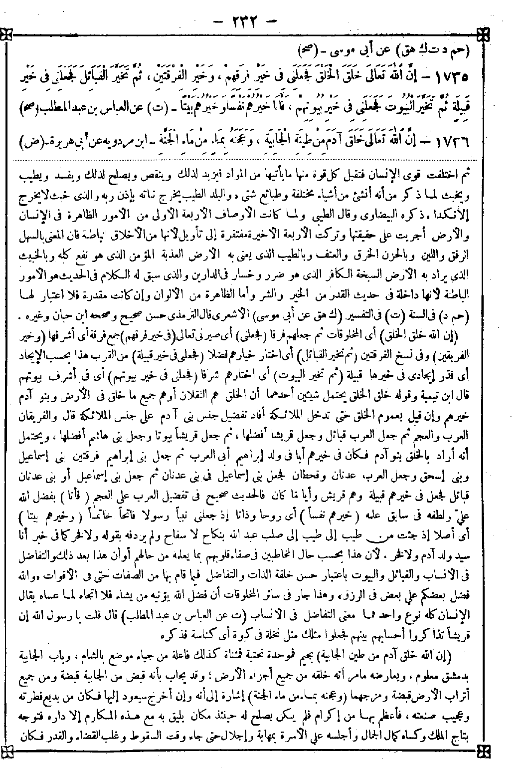 1735 - (إن الله خلق الخلق) أي المخلوقات ثم جعلهم فرقا (فجعلني) أي صيرني تعالى (في خير فرقهم) جمع فرقة أي أشرفها (وخير الفريقين) وفي نسخ الفرقتين (ثم تخير القبائل) أي اختار خيارهم فضلا (فجعلني في خير قبيلة) من القرب هذا بحسب الإيجاد أي قدر إيجادي في خيرها قبيلة (ثم تخير البيوت) أي اختارهم شرفا (فجعلني في خير بيوتهم) أي في أشرف بيوتهم قال ابن تيمية: وقوله خلق الخلق يحتمل شيئين أحدهما أن الخلق هم الثقلان أو هم جميع ما خلق في الأرض وبنو آدم خيرهم وإن قيل بعموم الخلق حتى تدخل الملائكة أفاد تفضيل جنس بني آدم على جنس الملائكة قال والفريقان العرب والعجم ثم جعل العرب قبائل وجعل قريشا أفضلها بيوتا وجعل بني هاشم أفضلها ويحتمل أنه أراد بالخلق بنو آدم فكان في خيرهم أبا في ولد إبراهيم أبي العرب ثم جعل بني إبراهيم فرقتين بني إسماعيل وبني إسحاق وجعل العرب عدنان وقحطان فجعل بني إسماعيل في بني عدنان ثم جعل بني إسماعيل أو بني عدنان قبائل فجعل في خيرهم قبيلة وهم قريش وأيا ما كان فالحديث صحيح في تفضيل العرب على العجم (فأنا) بفضل الله علي ولطفه في سابق علمه (خيرهم نفسا) أي روحا وذاتا إذ جعلني نبيا رسولا فاتحا خاتما (وخيرهم بيتا) أي أصلا إذ جئت من طيب إلى طيب إلى صلب عبد الله بنكاح لا سفاح ولم يردفه بقوله ولا فخر كما في خبر أنا سيد ولد آدم ولا فخر لأن هذا بحسب حال المخاطبين في صفاء قلوبهم بما يعلمه من حالهم أو أن هذا بعد ذلك والتفاضل في الأنساب والقبائل والبيوت باعتبار حسن خلقة الذات والتفاضل فيما قام بها من الصفات حتى في الأقوات {والله فضل بعضكم على بعض في الرزق} وهذا جار في سائر المخلوقات أن فضل الله يؤتيه من يشاء فلا إتجاه لما عساه يقال الإنسان كله نوع واحد فما معنى التفاضل في الأنساب