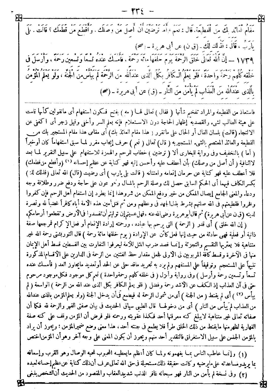 1739 - (إن الله خلق) أي قدر (الرحمة) التي يرحم بها عباده ورحمته إرادة الإنعام أو فعل الإكرام فمرجعها صفة ذاتية أو فعلية فهي حادثة من حيث إنها فعل كائن عن الإرادة (يوم خلقها مئة رحمة) قال التوربشتي: رحمة الله غير متناهية فلا يعتريها التقسيم والتجزئة وإنما قصد ضرب المثل للأمة ليعرفوا التفاوت بين القسطين قسط أهل الإيمان منها في الآخرة وقسط كافة المربوبين في الأولى فجعل مقدار حظ الفئتين من الرحمة في الدارين على الأقسام المذكورة تنبيها على المستعجم وتوفيقا على المستفهم ولم يرد به تجريد ما قد حلى عن الحد أو تعديد ما يجاوز العد (فأمسك عنده تسعا وتسعون رحمة وأرسل) وفي رواية وأنزل (في خلقه كلهم رحمة واحدة) تعم كل موجود فكل موجود مرحوم حتى في آن العذاب إذ الكف عن الآشد رحمة وفضل (فلو يعلم الكافر بكل الذي عند الله من الرحمة) الواسعة (لم ييأس (1)) أي لم يقنط (من الجنة) أي من شمول الرحمة له فيطمع في أن يدخل الجنة (ولو يعلم المؤمن بالذي عند الله من العذاب لم ييأس من النار) أي من دخولها قال الطيبي: سياق الحديث في بيان صفتي القهر والرحمة لله فكما أن صفاته تعالى غير متناهية لا يبلغ كنه معرفتها أحد فكذا عقوبته ورحمته فلو فرض أن المؤمن وقف على كنه صفة القهارية لظهر منها ما يقنط من ذلك الخلق طرا فلا يطمع في جنته أحد هذا معنى وضع ضمير المؤمن ويجوز أن يراد بالمؤمن الجنس على سبيل الاستغراق فالتقدير أحد منهم ويجوز أن يكون المعنى على وجه آخر وهو أن المؤمن اختص -[235]- بأن يطمع في الجنة فإذا انتفى منه فقد انتفى عن الكل وكذا الكافر مختص بالقنوط فإذا انتفى القنوط عنه انتفى عن الكل انتهى. وقال المظهر: ورد الحديث في بيان كثرة عقوبته ورحمته لئلا يغتر مؤمن برحمته فيأمن عذابه. وقال العلائي: هذا بيان واضح لوقوف العبد بين حالتي الرجاء والخوف وإن كان الخوف وقت الصحة ينبغي كونه أغلب أحواله لأن تمحض الخوف قد يوقعه في القنوط فينقله لحالة أشر من الذنوب