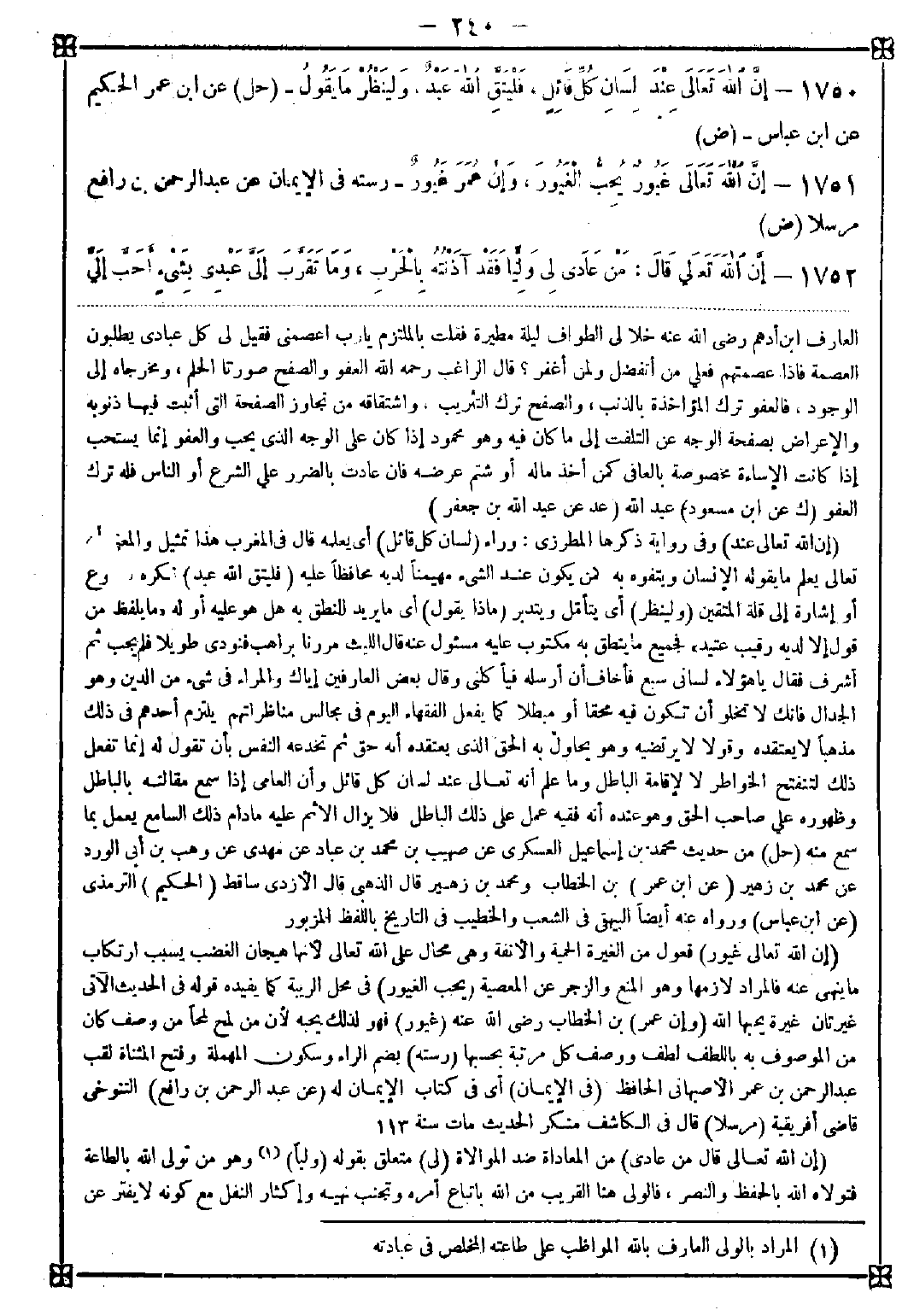 1752 - (إن الله تعالى قال من عادى) من المعاداة ضد الموالاة (لي) متعلق بقوله (وليا) (1) وهو من تولي الله بالطاعة فتولاه الله بالحفظ والنصر فالولي هنا القريب من الله باتباع أمره وتجنب نهيه وإكثار النفل مع كونه لا يفتر -[241]- عن ذكره ولا يرى بقلبه سواه (فقد آذنته بالحرب) أي أعلمته بأني سأحاربه {فإن لم تفعلوا فأذنوا بحرب من الله ورسوله} ومن حاربه الله أي عامله معاملة المحارب من التجلي عليه بمظاهر القهر والجلال وهذا في الغاية القصوى من النهديد والمراد عادى وليا لأجل ولايته لا مطلقا فخرج نحو محاكمته لخلاص حق أو كشف غامض فلا يرد خصومة العمرين رضي الله عنهما لعلي والعباس رضي الله عنهما ومعاداته لولايته إما بإنكارها عنادا أو حسدا أو بسبه أو شتمه ونحو ذلك من ضروب الإيذاء وإذا علم ما في معاداته من الوعيد علم ما في موالاته من الثواب (وما تقرب إلي عبدي بشيء) أي بفعل طاعة (أحب إلي مما افترضه عليه (2) أي من آدابه عينا أو كفاية لأنها الأصل الذي ترجع إليه جميع الفروع والأمر بها جازم يتضمن أمرين الثواب على فعلها والعقاب على تركها فالفرض كالأس والنفل كالبناء عليه (ولا يزال عبدي) الإضافة للتشريف (يتقرب) وفي رواية يتحبب (إلي بالنوافل) أي التطوع من جميع صنوف العبادة (حتى أحبه) بضم أوله وفتح ثالثه (فإذا أحببته) لتقربه إلي بما ذكر حتى قلبه بنور معرفتي (كنت) أي صرت (سمعه الذي يسمع به وبصره الذي يبصر به ويده الذي يبطش بها ورجله التي يمشي بها) يعني يجعل الله سلطان حبه غالبا حتى لا يرى ولا يسمع ولا يفعل إلا ما يحبه الله عونا له على حماية هذه الجوارح عما لا يرضاه أو هو كناية عن نصرة الله وتأييده وإعانته له في كل أموره وحماية سمعه وبصره وسائر جوارحه عما لا يرضاه وحقيقة القول ارتهان كلية العبد بمراضي الرب على سبيل الاتساع فإنهم إذا أرادوا اختصاص شيء بنوع اهتمام وعناية واستغراق فيه ووله به ونزوع إليه سلكوا هذا الطريق قال:
