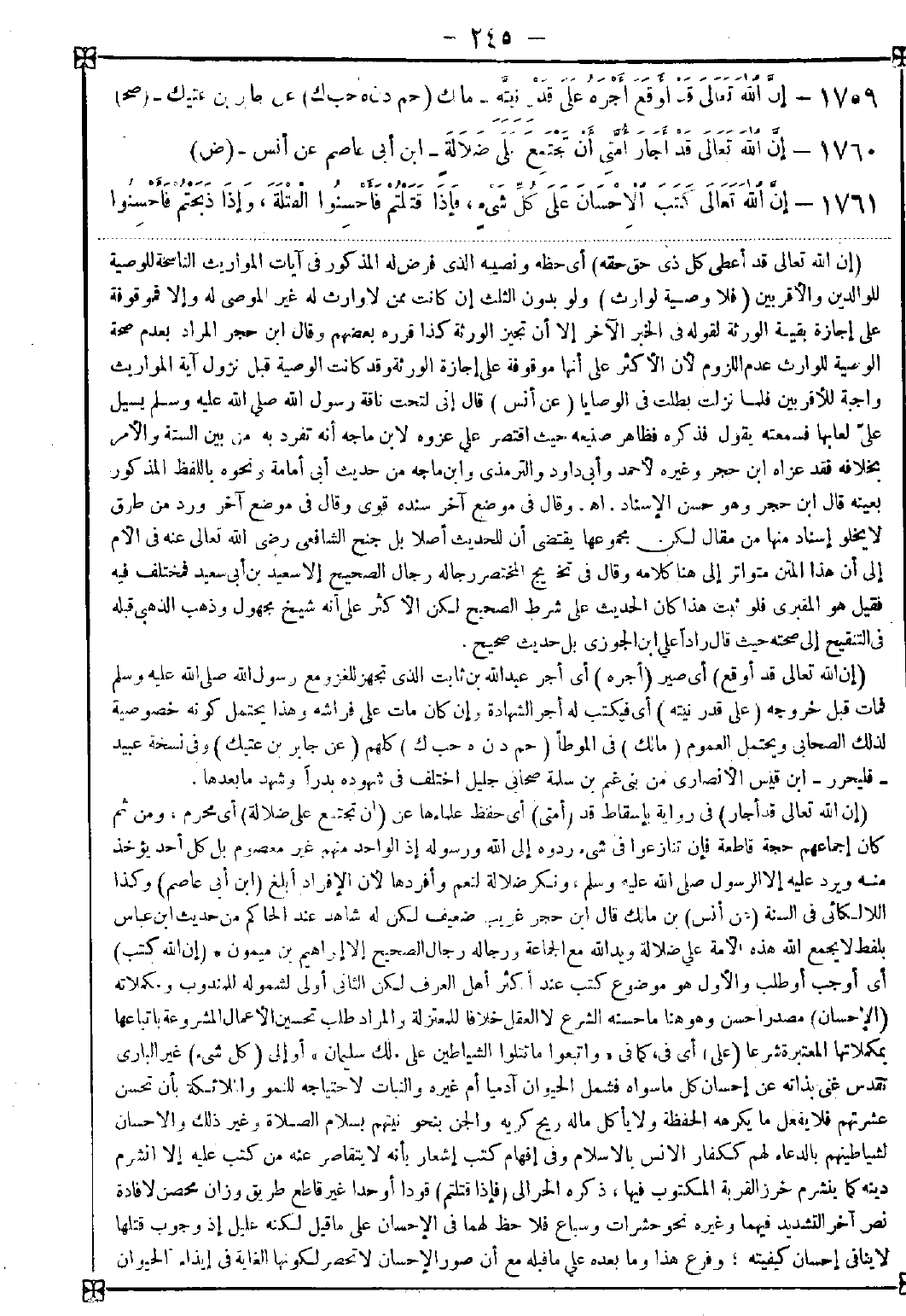1761 - (إن الله كتب) أي أوجب أو طلب والأول هو موضوع كتب عند أكثر أهل العرف لكن الثاني أولى لشموله للمندوب ومكملاته (الإحسان) مصدر أحسن وهو هنا ما حسنه الشرع لا العقل خلافا للمعتزلة والمراد طلب تحسين الأعمال المشروعة باتباعها بمكملاتها المعتبرة شرعا (على) أي في كما في {واتبعوا ما تتلوا الشياطين على ملك سليمان} أو إلى (كل شيء) غير الباري تقدس غني بذاته عن إحسان كل ما سواه فشمل الحيوان آدميا أم غيره والنبات لاحتياجه للنمو والملائكة بأن تحسن عشرتهم فلا يفعل ما يكرهه الحفظة ولا يأكل ماله ريح كريه والجن بنحو نيتهم بسلام الصلاة وغير ذلك والإحسان لشياطينهم بالدعاء لهم ككفار الإنس وبالإسلام وفي إفهام كتب إشعار بأنه لا يتقاصر عنه من كتب عليه إلا انشرم دينه كما ينشرم خرز القربة المكتوب فيها ذكره الحرالي (فإذا قتلتم) قودا أو حدا غير قاطع طريق وزان محصن لإفادة نص آخر التشديد فيهما وغيره نحو حشرات وسباع فلا حظ لهما في الإحسان على ما قيل لكنه عليل إذ وجوب قتلها لا ينافي إحسان كيفيته وفرع هذا وما بعده على ما قبله مع أن صور الإحسان لا تحصر لكونها الغاية في إيذاء الحيوان -[246]- فإذا طلب الإحسان إليهما فغيرهما أولى (فأحسنوا القتلة) بكسر القاف هيئة القتل بأن يختاروا أسهل الطرق وأخفها إيلاما وأسرعها زهوقا لكن تراعى المثلية في القاتل في الهيئة والآلة إن أمكن وإلا كلواط وسحر فالسيف (وإذا ذبحتم) بهيمة تحل (فأحسنوا الذبحة) بالكسر بالرفق بها فلا يصرعها بعنف ولا يجرها لتذبح بعنف وبإحداد الآلة وتوجيهها للقبلة والتسمية والإجهاز ونية التقرب بذبحها وإراحتها وتركها إلى أن تبرد وشكر الله حيث سخرها لنا ولم يسلطها علينا ولا يذبحها بحضرة أخرى سيما بنتها أو أمها (وليحد أحدكم) أي كل ذابح (شفرته) بالفتح وجوبا في الكالة وندبا في غيرها وهي السكين وشفرتها حدها فسميت به تسمية للشيء باسم جزئه وينبغي مواراتها منها حال حدها للأمر به في خبر (وليرح) بضم أوله من أراح إذا حصلت له راحة (ذبيحته) بسقيها عند الذبح ومر السكين عليها بقوة ليسرع موتها فترتاح وبالإمهال بسلخها حتى تبرد وعطف ذا على ما قبله لبيان فائدته إذ الذبح بآلة كالة يعذبها فراحتها ذبحها بآلة ماضية والذبيحة فعيلة بمعنى مفعولة وتاؤها للنقل من الوصفية إلى الإسمية قالوا وهذا الحديث من قواعد الدين