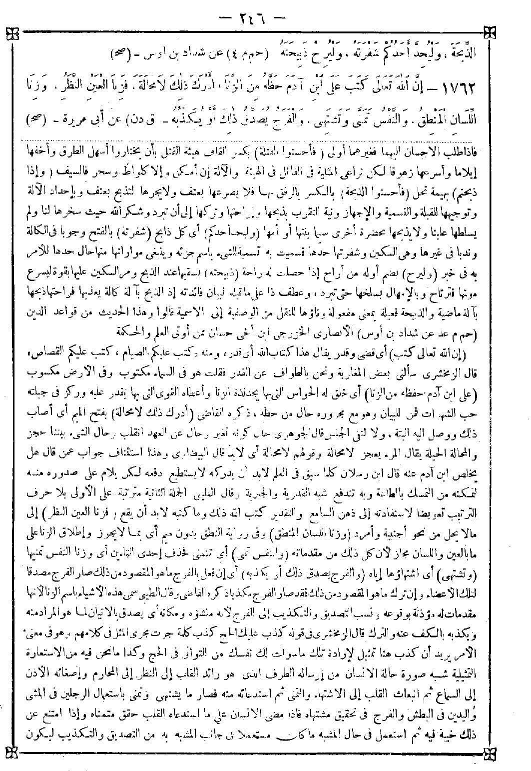 1762 - (إن الله تعالى كتب) أي قضى وقدر يقال هذا كتاب الله أي قدره ومنه {كتب عليكم الصيام} {كتب عليكم القصاص} . قال الزمخشري: سألني بعض المغاربة ونحن بالطواف عن القدر فقلت هو في السماء مكتوب في الأرض مكسوب (على ابن آدم حظه من الزنا) أي خلق له الحواس التي بها يجد لذة الزنا وأعطاه القوى التي بها يقدر عليه وركز في جبلته حب الشهوات فمن للبيان وهو مع مجروره حال من حظه ذكره القاضي (أدرك ذلك لا محالة) بفتح الميم أي أصاب ذلك ووصل إليه البتة ولا لنفي الجنس قال الجوهري: حال كونه تغير وحال عن العهد انقلب وحال الشيء بيننا حجز والمحالة الحيلة يقال المرء يعجز لا محالة وقولهم لا محالة أي لا بد قال البيضاوي: وهذا استئناف جواب عمن قال هل يخلص ابن آدم عنه قال ابن رسلان كلما سبق في العلم لا بد أن يدركه لا يستطيع دفعه لكن يلام على صدوره منه لتمكنه من التمسك بالطاعة وبه تندفع شبه القدرية والجبرية وقال الطيبي: الجملة الثانية مترتبة على الأولى بلا حرف الترتيب تعويضا لاستفادته إلى ذهن السامع والتقدير كتب الله ذلك وما كتبه لا بد أن يقع (فزنا العين النظر) إلى ما لا يحل من نحو أجنبية وأمرد (وزنا اللسان المنطق) وفي رواية النطق بدون ميم أي بما لا يجوز وإطلاق الزنا على ما بالعين واللسان مجاز لأن كل ذلك من مقدماته (والنفس تمنى) أي تتمنى فحذف إحدى التاءين أي وزنا النفس تمنيها (وتشتهي) أي اشتهاؤها إياه (والفرج يصدق ذلك أو يكذبه) أي إن فعل بالفرج ما هو المقصود من ذلك صار الفرج مصدقا لتلك الأعضاء وإن ترك ما هو المقصود من ذلك فقد صار الفرج مكذبا ذكره القاضي وقال الطيبي: سمى هذه الأشياء باسم الزنا لأنها مقدمات له مؤذنة بوقوعه ونسب التصديق والتكذيب إلى الفرج لأنه منشؤه ومكانه أي يصدق بالإتيان لما هو المراد منه ويكذبه بالكف عنه والترك قال الزمخشري في قوله كذب عليك الحج كذب كلمة جرت مجرى المثل في كلامهم وهو في معنى الأمر يريد أن كذب هنا تمثيل لإرادة تلك ما سولت لك نفسك من التواني في الحج وكذا ما نحن فيه من الاستعارة التمثيلية شبه صورة حالة الإنسان من إرساله الطرف الذي هو رائد القلب إلى النظر إلى المحارم وإصغائه الأذن إلى السماع ثم انبعاث القلب إلى الإشتهاء والتمني ثم استدعائه منه فصار ما يشتهى وتمنى باستعمال الرجلين في المشي واليدين في البطش والفرج في تحقيق مشتهاه فإذا مضى الإنسان على ما استدعاه القلب حقق متمناه وإذا امتنع عن ذلك خيبة فيه ثم استعمل في حال المشبه ما كان مستعملا في جانب المشبه به من التصديق والتكذيب ليكون -[247]- قرينة للتمثيل وقد نظر المحاسبي رضي الله عنه إلى هذا حيث قال: