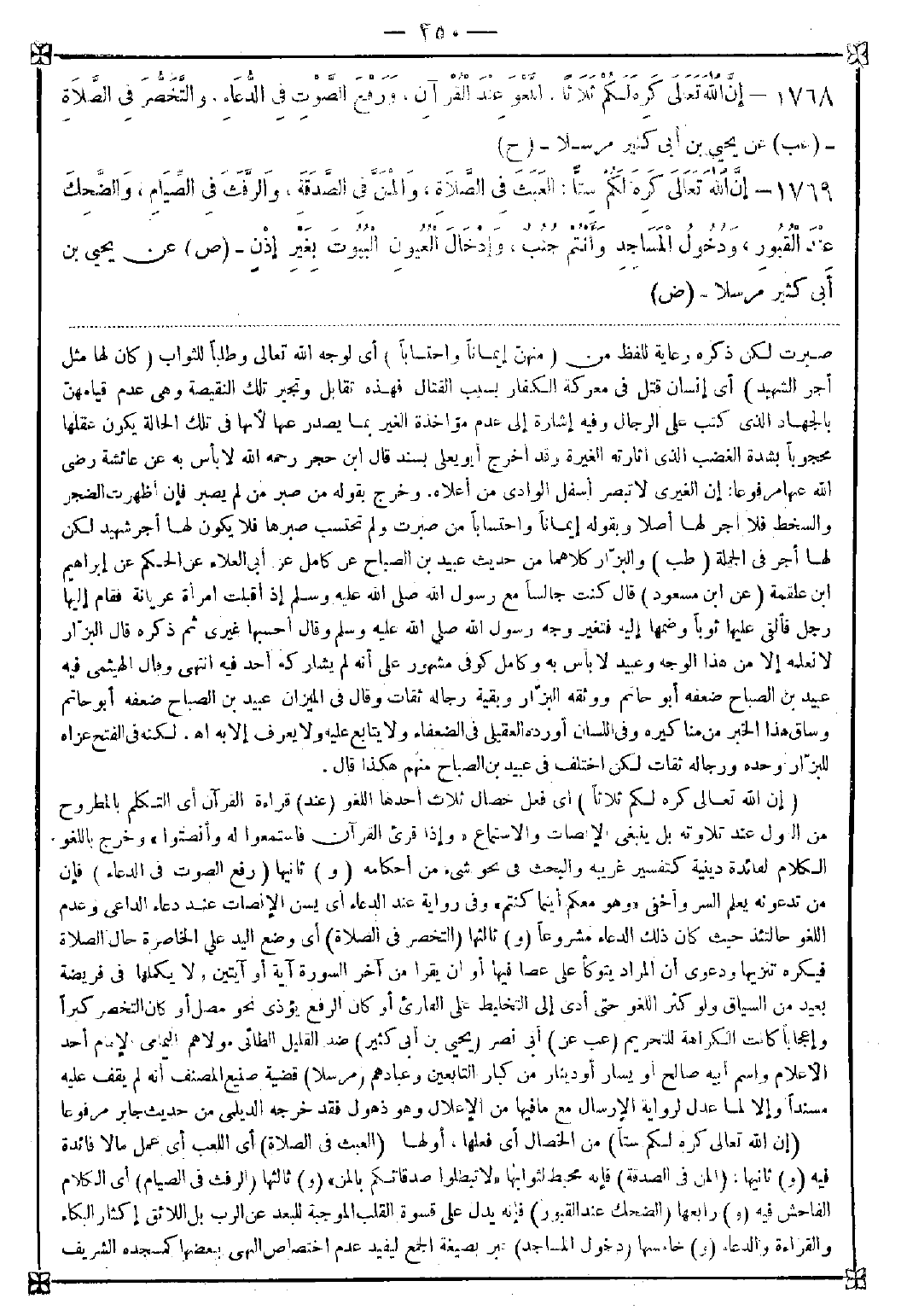 1769 - (إن الله تعالى كره لكم ستا) من الخصال أي فعلها أولها: (العبث في الصلاة) أي اللعب أي عمل ما لا فائدة فيه (و) ثانيها: (المن في الصدقة) فإنه محبط لثوابها {لا تبطلوا صدقاتكم بالمن} (و) ثالثها: (الرفث في الصيام) أي الكلام الفاحش فيه (و) رابعها: (الضحك عند القبور) فإنه يدل على قسوة القلب الموجبة للبعد عن الرب بل اللائق إكثار البكاء والقراءة والدعاء (و) خامسها: (دخول المساجد) عبر بصيغة الجمع ليفيد عدم اختصاص النهي ببعضها كمسجده الشريف -[251]- أو الحرم المكي أو الأقصى (وأنتم جنب) يعني دخولها بغير مكث فإنه مكروه تنزيها أو خلاف الأولى ومع اللبث حرام (و) سادسها: (إدخال العيون البيوت) عمدا (بغير إذن) من أهلها يعني نظر الأجنبي إلى من في داخل بيت غيره بغير إذنه فإنه يكره تحريما ومن ثم جاز لرب الدار أن يخذقه ويفقأ عينه أي إن لم يندفع إلا بذلك