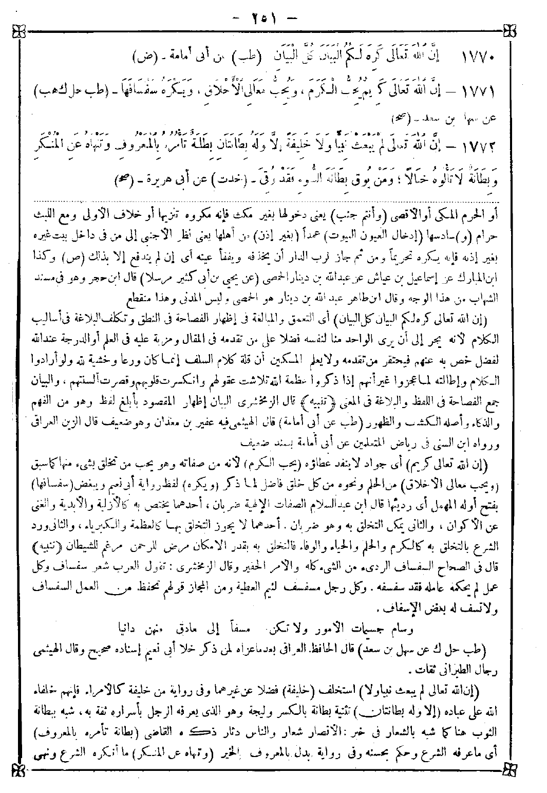 1770 - (إن الله تعالى كره لكم البيان كل البيان) أي التعمق والمبالغة في إظهار الفصاحة في النطق وتكلف البلاغة في أساليب الكلام لأنه يجر إلى أن يرى الواحد منا لنفسه فضلا على من تقدمه في المقال ومزية عليه في العلم أو الدرجة عند الله لفضل خص به عنهم فيحتقر من تقدمه ولا يعلم المسكين أن قلة كلام السلف إنما كان ورعا وخشية لله ولو أرادوا الكلام وإطالته لما عجزوا غير أنهم إذا ذكروا عظمة الله تلاشت عقولهم وانكسرت قلوبهم وقصرت ألسنتهم والبيان جمع الفصاحة في اللفظ والبلاغة في المعنى <تنبيه> قال الزمخشري: البيان إظهار المقصود بأبلغ لفظ وهو من الفهم والذكاء وأصله الكشف والظهور