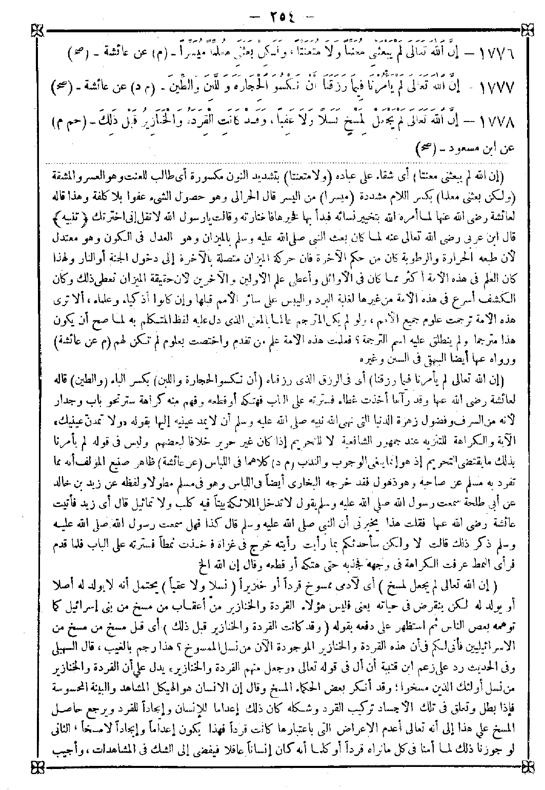 -[254]- 1776 - (إن الله لم يبعثني معنتا) أي شقاء على عباده (ولا متعنتا) بتشديد النون مكسورة أي طالب للعنت وهو العسر والمشقة (ولكن بعثني معلما) بكسر اللام مشددة (ميسرا) من اليسر قال الحرالي: وهو حصول الشيء عفوا بلا كلفة وهذا قاله لعائشة رضي الله عنها لما أمره الله بتخيير نسائه فبدأ بها فخيرها فاختارته وقال يا رسول الله لا تقل إني اخترتك <تنبيه> قال ابن عربي رضي الله تعالى عنه: لما كان بعث النبي صلى الله عليه وسلم بالميزان وهو العدل في الكون وهو معتدل لأن طبعه الحرارة والرطوبة كان من حكم الآخرة فإن حركة الميزان متصلة بالآخرة إلى دخول الجنة أو النار ولهذا كان العلم في هذه الأمة أكثر مما كان في الأوائل وأعطي علم الأولين والآخرين لأن حقيقة الميزان تعطي ذلك وكان الكشف أسرع في هذه الأمة من غيرها لغلبة البرد واليبس على سائر الأمم قبلها وإن كانوا أذكياء وعلماء ألا ترى هذه الأمة ترجمت جميع علوم الأمم ولو لم يكن المترجم عالما بالمعنى الذي دل عليه لفظ المتكلم به لما صح أن يكون هذا مترجما ولم ينطلق عليه اسم الترجمة؟ فعلمت هذه الأمة علم من تقدم واختصت بعلوم لم تكن لهم