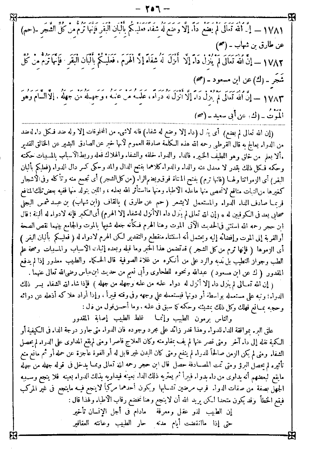 -[256]- 1781 - (إن الله تعالى لم يضع) أي ينزل (داء إلا وضع له شفاء) فإنه لا شيء من المخلوقات إلا وله ضد فكل داء له ضد من الدواء يعالج به قال القرطبي رحمه الله: هذه الكلمة صادقة العموم لأنها خبر عن الصادق البشير عن الخالق القدير {ألا يعلم من خلق وهو اللطيف الخبير} فالداء والدواء خلقه والشفاء والهلاك فعله وربط الأسباب بالمسببات حكمته وحكمه فكل ذلك بقدر لا معدل عنه والداء والدواء كلاهما بفتح الدال والمد وحكى كسر دال الدواء (فعليكم بألبان البقر) أي الزموا تناولها (فإنها ترم) بفتح المثناة وبضم الراء (من كل الشجر) أي تجمع منه وتأكله وفي الأشجار كغيرها من النبات منافع لا تحصى منها ما علمه الأطباء ومنها ما استأثر الله بعلمه واللبن يتولد منها ففيه بعض تلك المنافع فربما صادف الداء الدواء والمستعمل لا يشعر